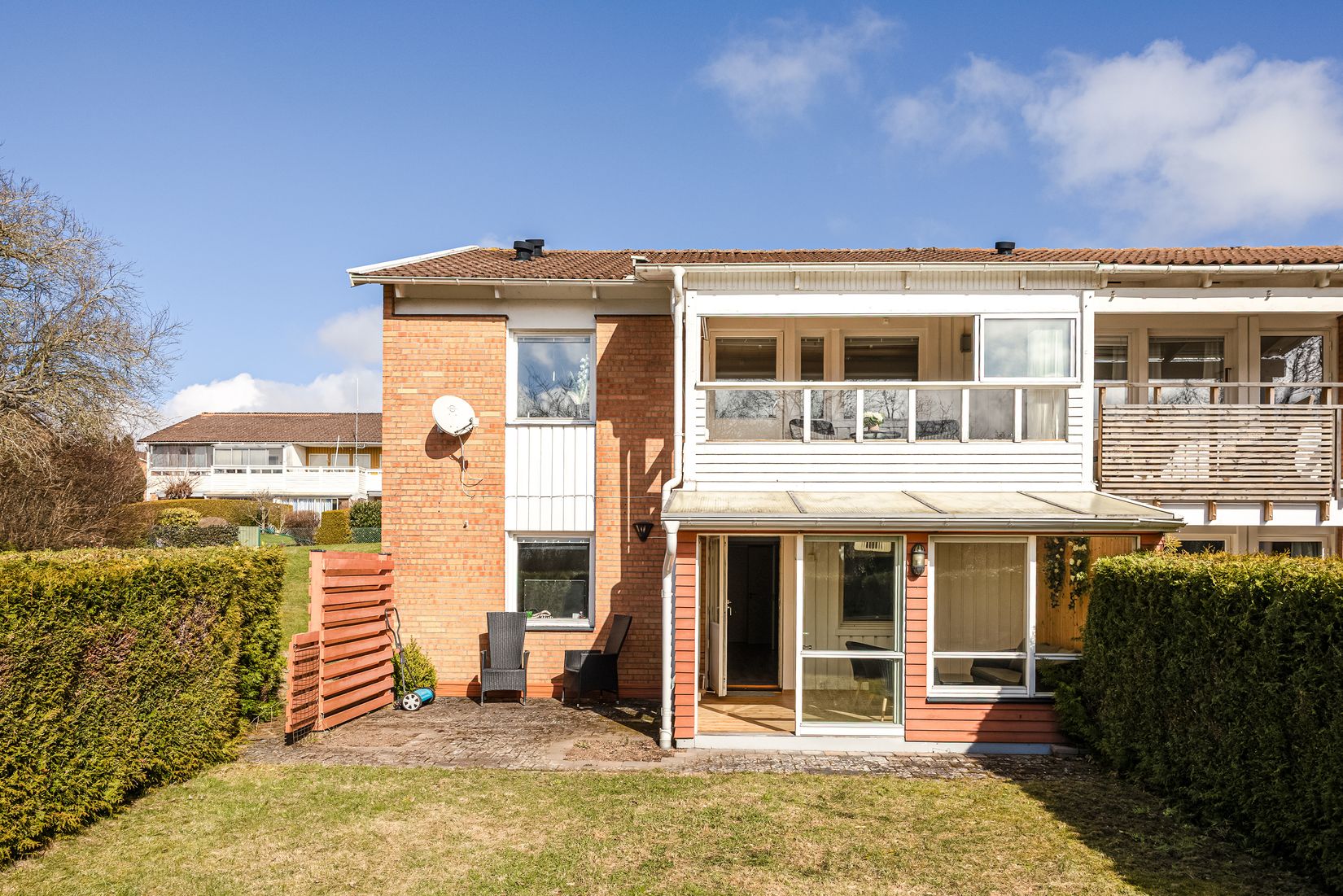 Detta trevliga suterrängradhus med hörnläge på Nya Kungsgården erbjuder 127 kvm av modern komfort och stilrent designade ytor, perfekt för både familj och sällskap. Huset har fem rum och kök, inklusive ett elegant kök med släta grå luckor, induktionshäll och smakfullt kakel som stänkskydd. Vardagsrummet erbjuder en generös känsla med laminatgolv och utgång till inglasad balkong. .