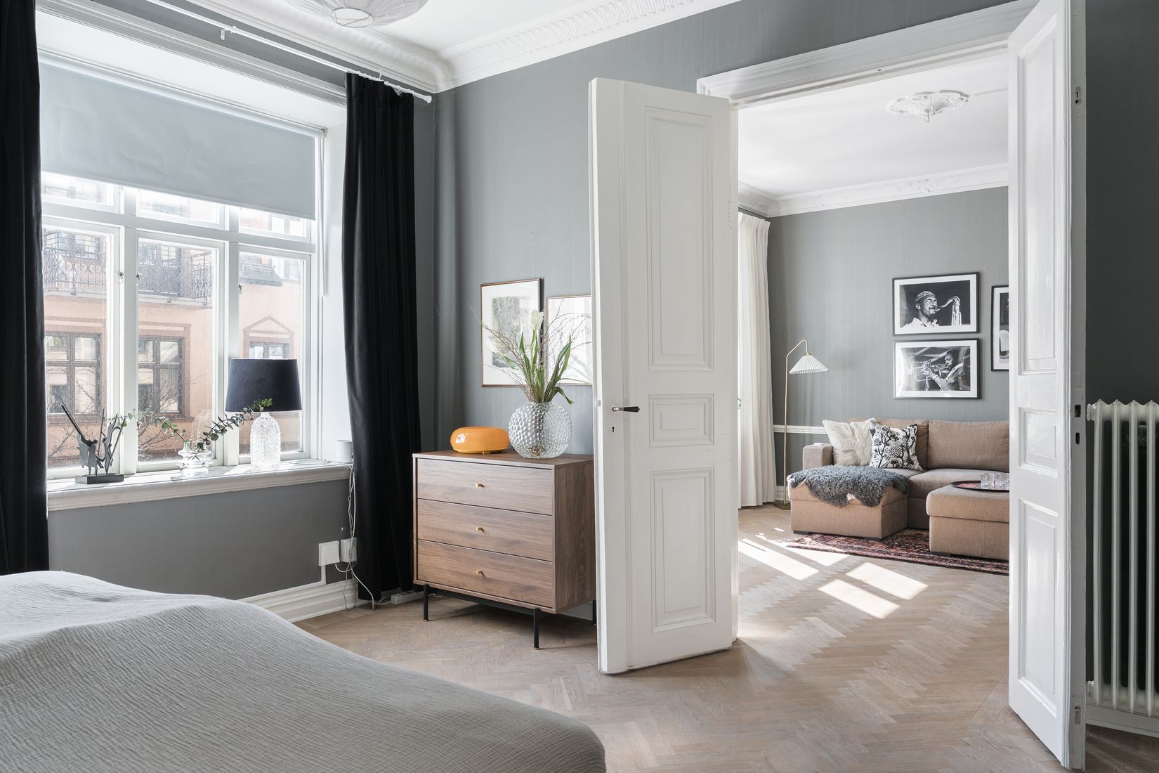 De välbevarade byggdetaljerna från stuckaturer och takrosetter till fiskbensparkett, generös takhöjd, förtjusande fönsterpartier och eleganta dubbeldörrar samspelar med genomtänkta materialval och sobra kulörer i en helhet som andas själ och kvalitet. Här möts historia och nutid i perfekt balans.