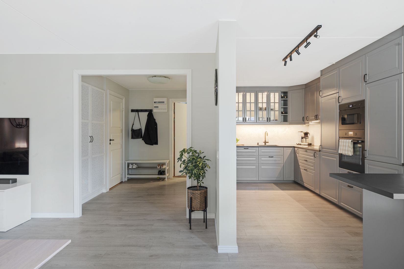 Den genomtänkta planlösningen erbjuder utmärkta sociala ytor i vinkel vilket ger fin kontakt mellan funktionerna samtidigt som det ger en tydlig och utmärkt avgränsning mellan dem. Vardagsrummet med generös matplats och utgång till den inglasade balkongen har halvöppen planlösning mot köket i vinkel med klassisk grå köksinredning och köksö med plats för barstolar. Sovrumsavdelningen nås via vardagsrummet och består av en rymlig inre hall med generöst med förvaring i fem platsbyggda garderober. Den inre hallen leder till två fina sovrum och ett helkaklat duschrum med tvättsektion. Även i entrén finns det två platsbyggda garderober och härifrån nås även en gäst wc. Till lägenheten hör även ett förråd och extra förråd finns att hyra för en kostnad mellan 100-250 kr/mån beroende på storlek.