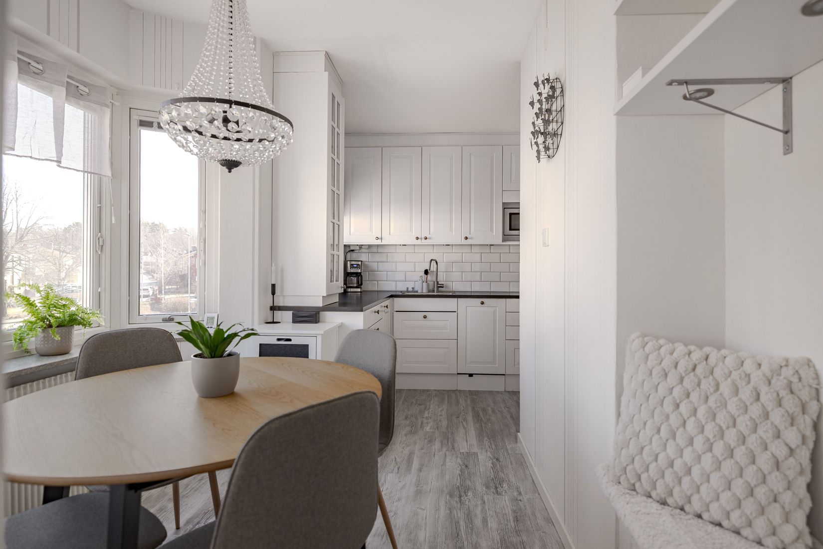 Det rymliga vardagsrummet erbjuder generösa sällskapsytor med plats för både soffgrupp och övrig möblering. Härifrån når ni även balkongen som ligger i ett behagligt solläge och blir en naturlig förlängning av rummet under årets varmare månader.