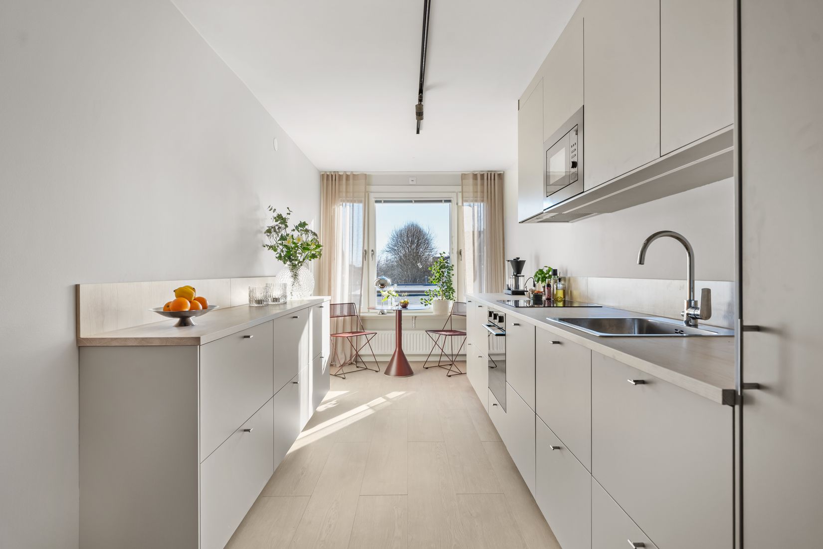Den generösa planlösningen skapar ett hem som känns både luftigt och socialt. Det stilrena köket, i varma och harmoniska toner, smälter elegant samman med det ljusa allrummet – en perfekt plats för såväl vardagsliv som middagar med vänner. Från allrummet nås den inglasade balkongen, som förlänger säsongen och bjuder in till umgänge stora delar av året.