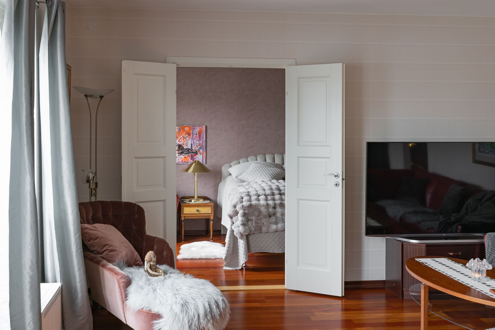 Redan vid första steget in möts du av ett imponerande ljusflöde och en härlig rymd tack vare den generösa takhöjden om 2,6 meter. De vackra dubbeldörrarna och stora öppningarna mellan rummen förstärker känslan av elegans och skapar ett luftigt, socialt hem.