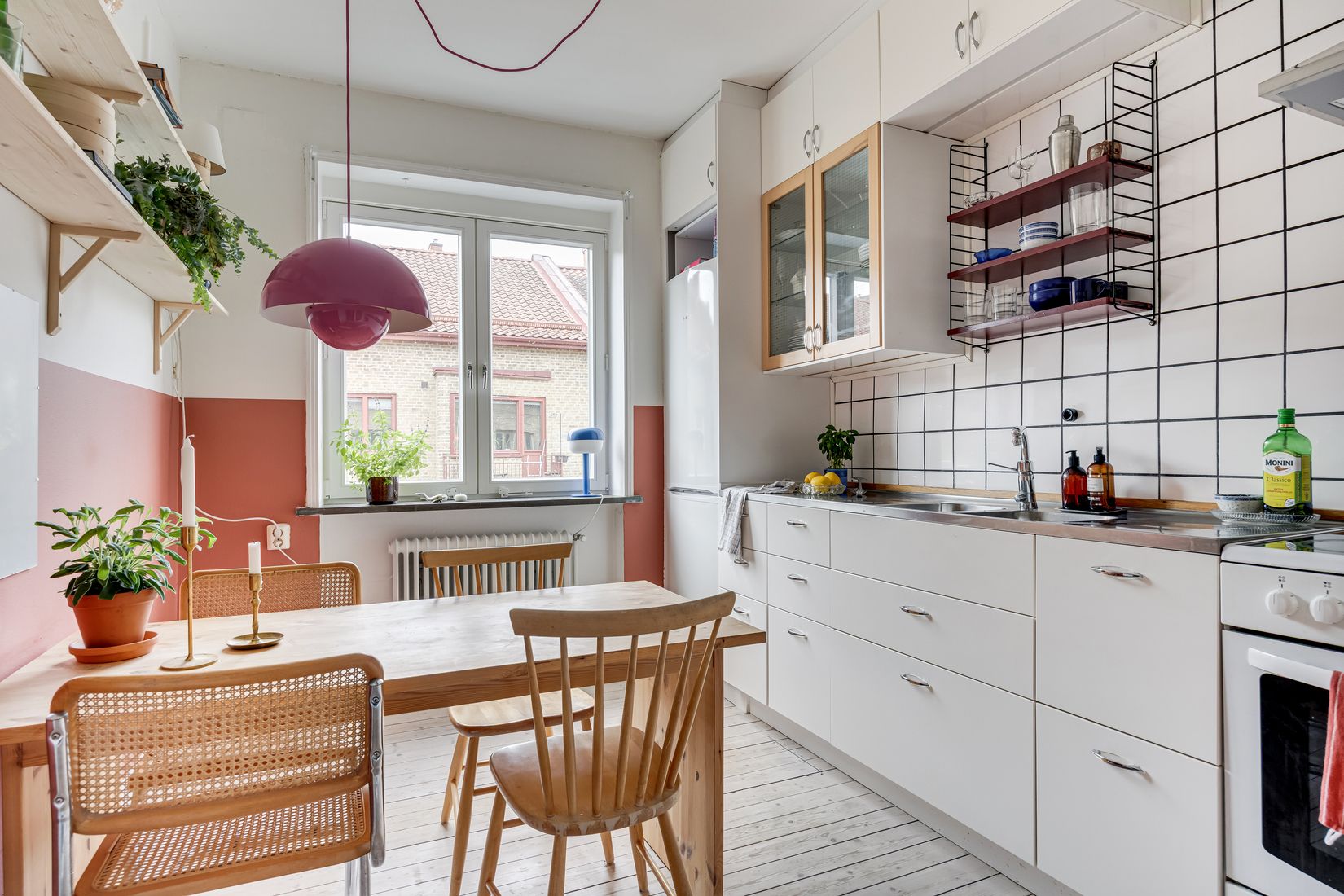 Kök – Trivsamt kök med vitlaserade luckor, vitt kakel och arbetsytor i rostfritt. Väggarna är målade i puts med en dekorativ halvvägg i rött och vitt. Här finns spis, ugn, kyl/frys och fläkt samt gott om plats för matbord för upp till 6 personer.