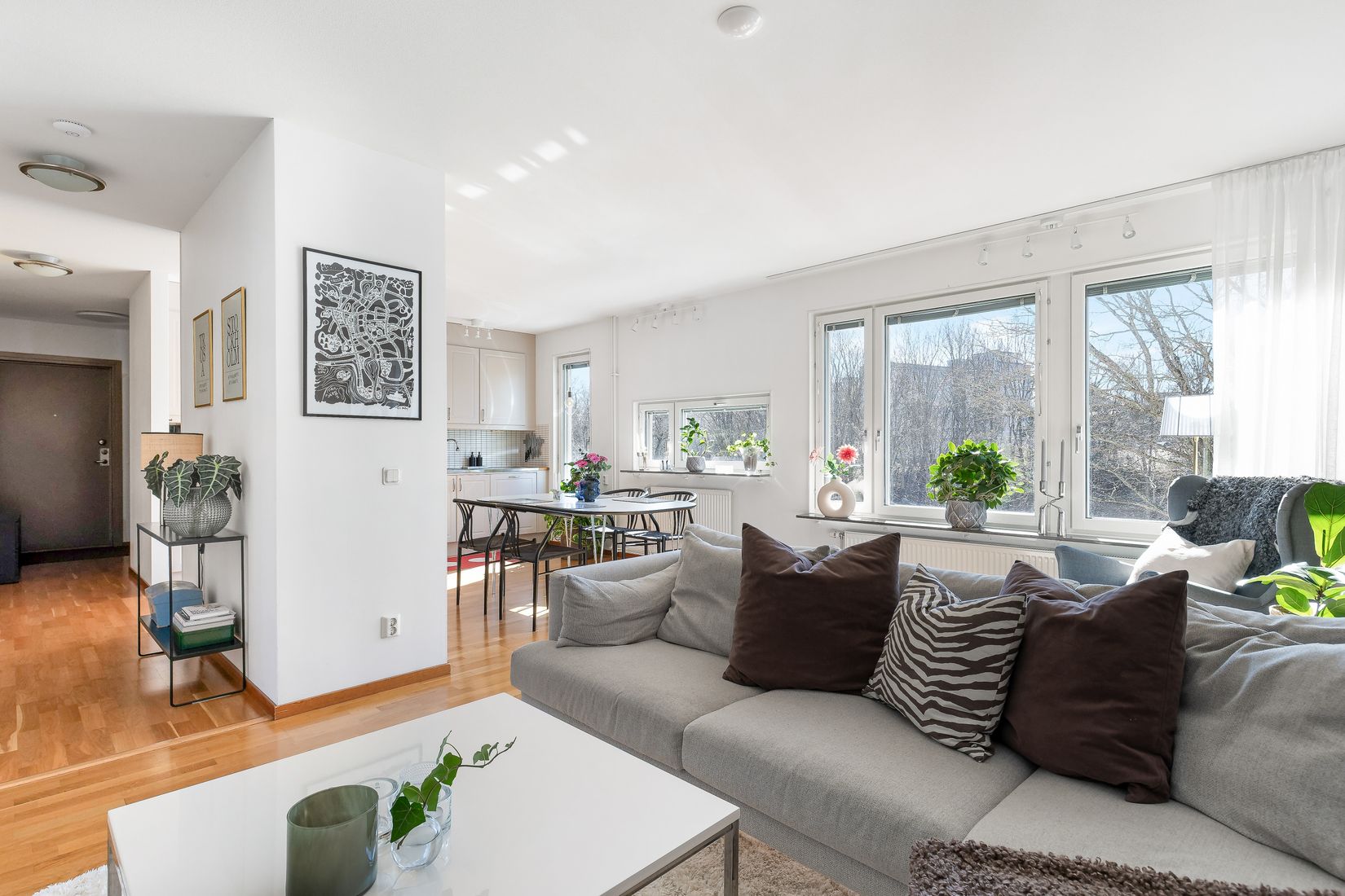 Här bor du med en fin panoramavy från de stora fönsterpartierna. På husets baksida finns balkongen som har utsikt mot den fina grönskande parken.