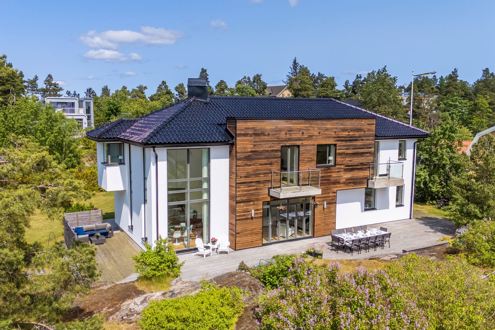 De soliga och stora uteplatserna och balkongerna inbjuder till att spendera mycket tid utomhus. På den rymliga tomten finns gott om plats för barnens lek, studsmatta samt odlingar.