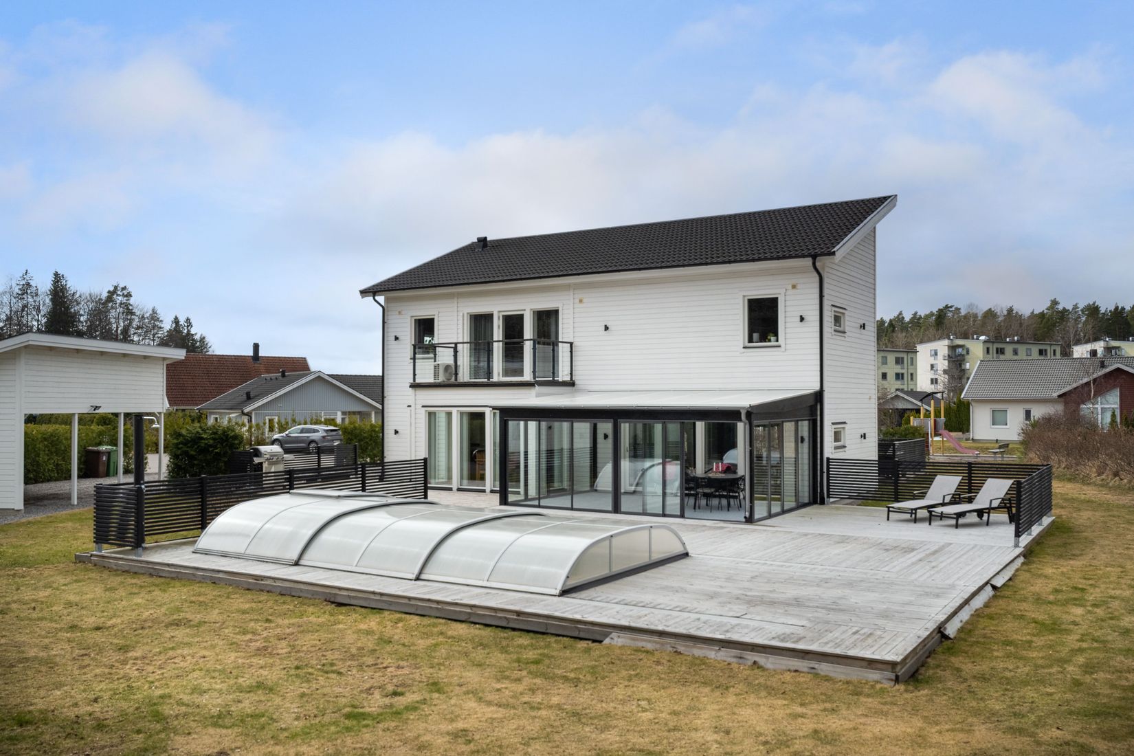 Bostaden är belägen i ett nybyggt och barnvänligt område på en lugn återvändsgata, med närhet till natur och lekplatser. Den plana gräsmattan ger gott om utrymme för lek, studsmatta eller poolbad. Uppfarten erbjuder plats för flera bilar utöver carporten.