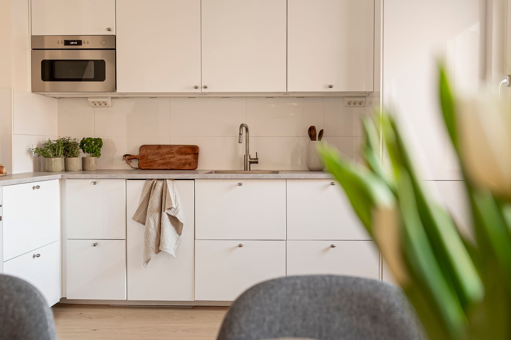 Köket är stilrent renoverat med ljusa skåpsluckor, generösa arbetsytor och gott om förvaring. Här finns moderna vitvaror och en genomtänkt planering som gör köket både funktionellt och trivsamt.