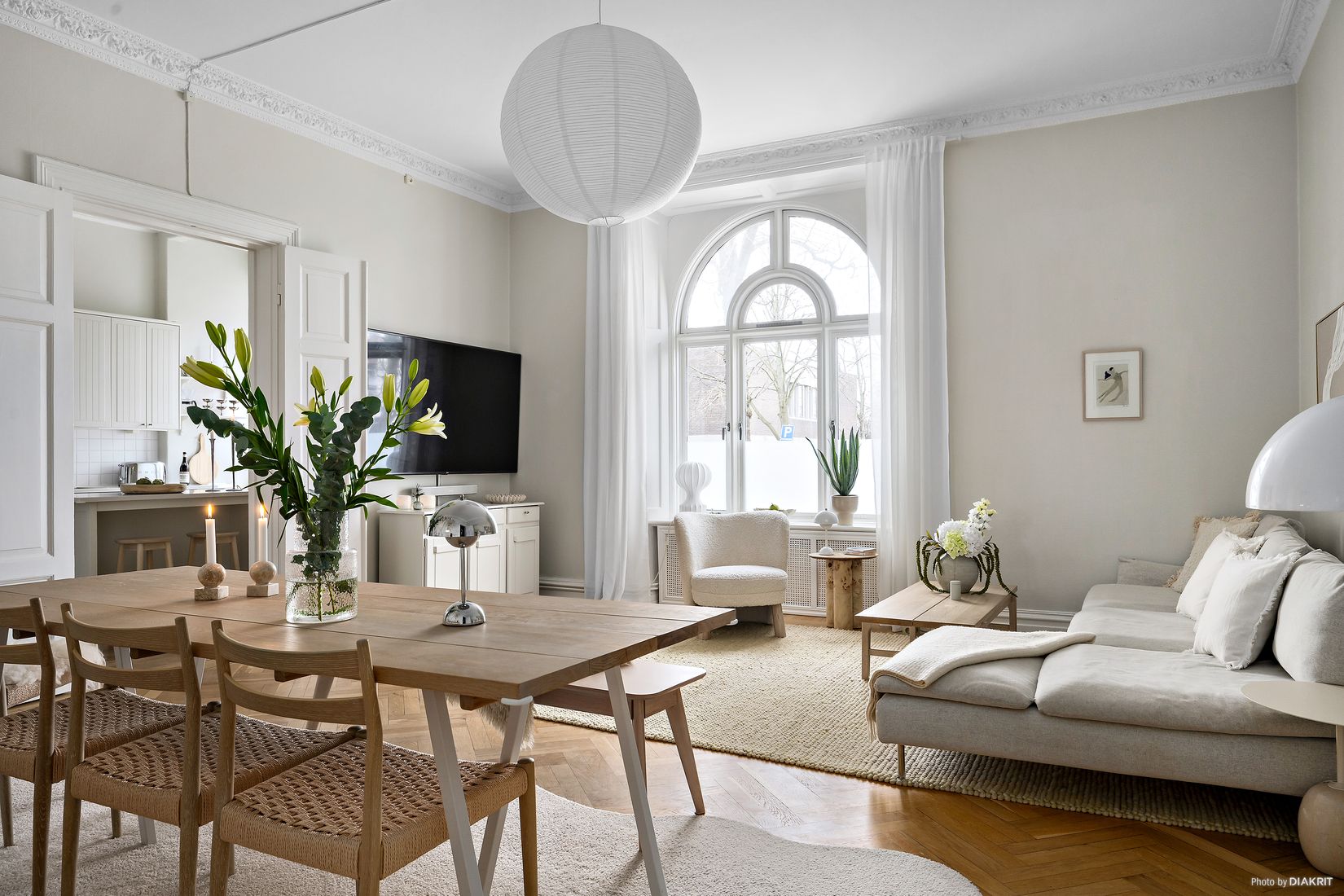 Välkommen till denna fantastiska lägenhet i vacker fastighet. Här välkomnas man av unika originaldetaljer såsom takrosetter, stuckatur, fiskbensparkett, och vackra dörrar som samsas med smakfullt utvalda moderna materialval. Bostaden har en generös rymd och ett alldeles unikt fönster som vetter mot stadsparken och skänker ett underbart ljus till det stora vardagsrummet.