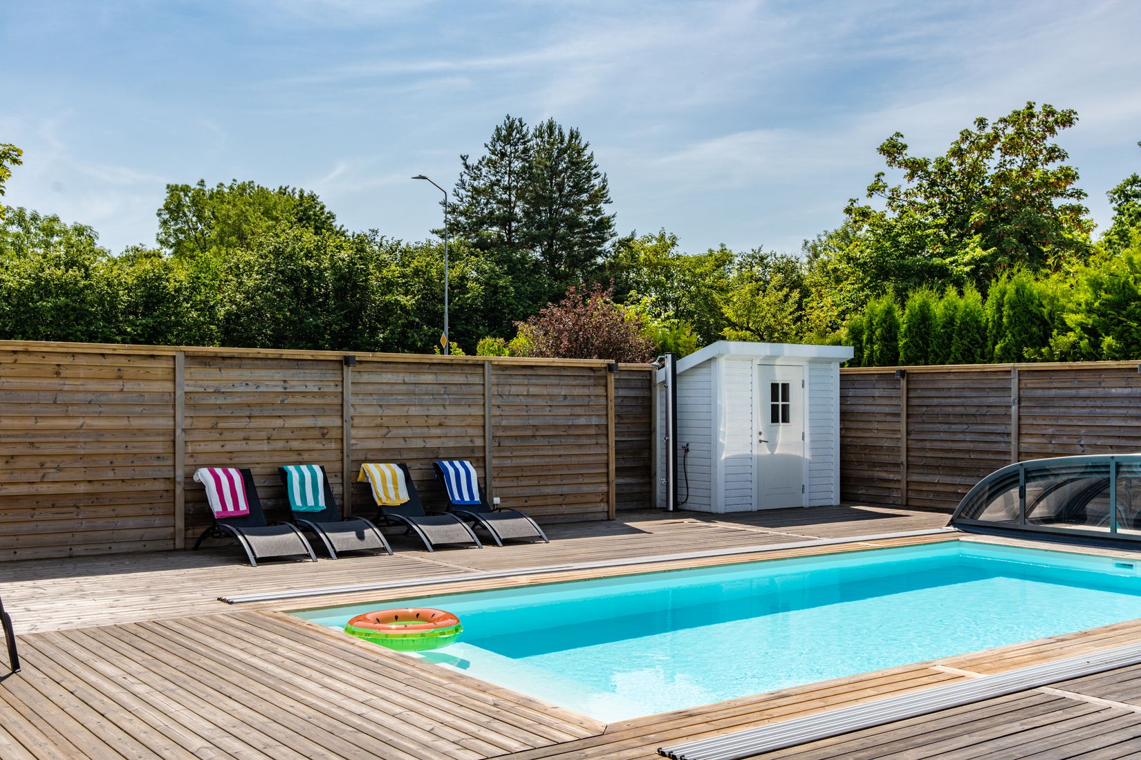 Utemiljön med saltvattenpool, trädäck och utekök gör att denna fastighet sticker ut !