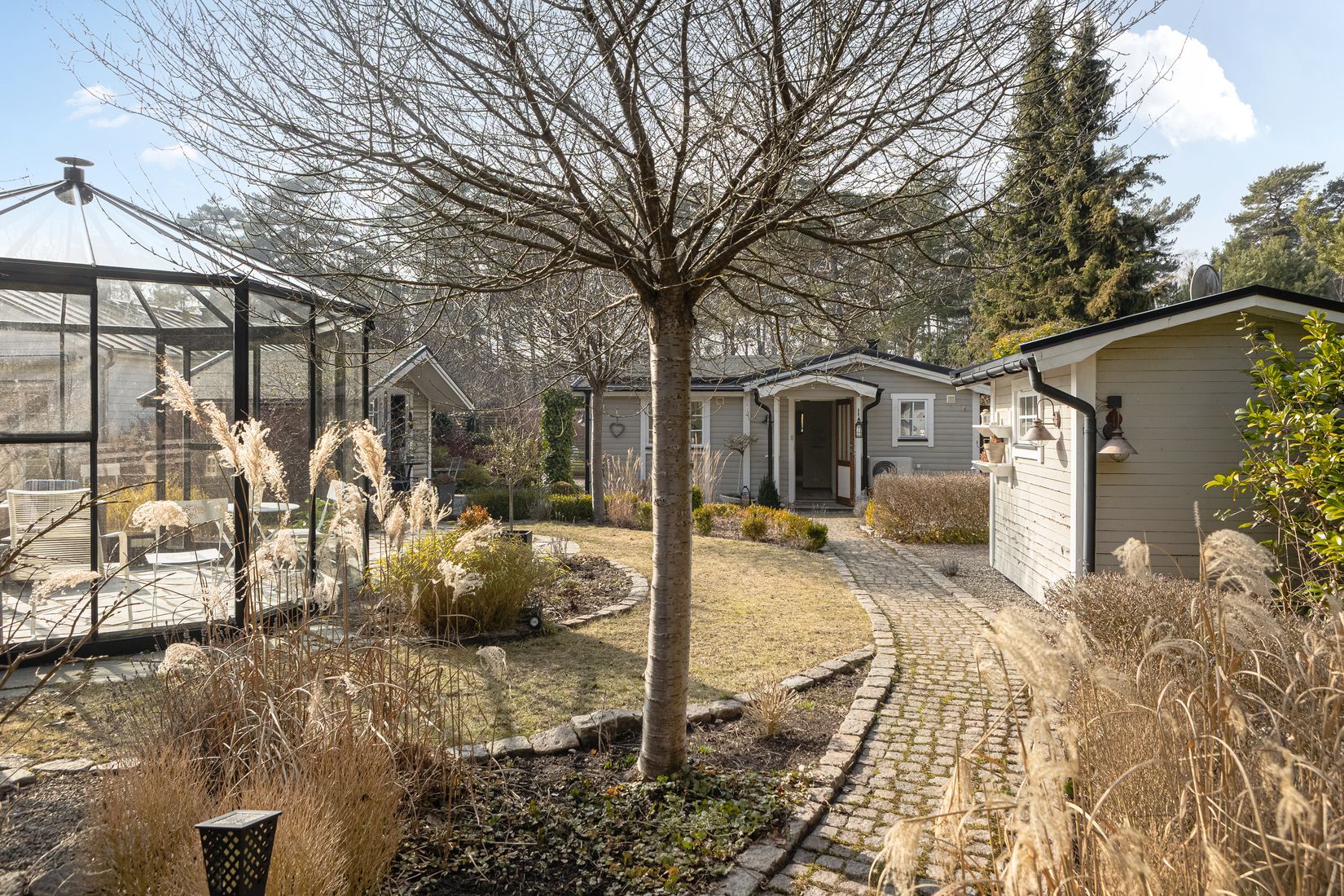 Villans trädgård är en arkitektritad oas med flera gröna rum, perfekta för avkoppling i både sol och skugga. Den generösa tomtarean på 589 kvadratmeter rymmer även en isolerad gäststuga, ett förråd med cykelskjul samt ett lusthus i glas, vilket ger gott om plats för kreativitet och aktiviteter. Fågelkvitter vågar utlovas!