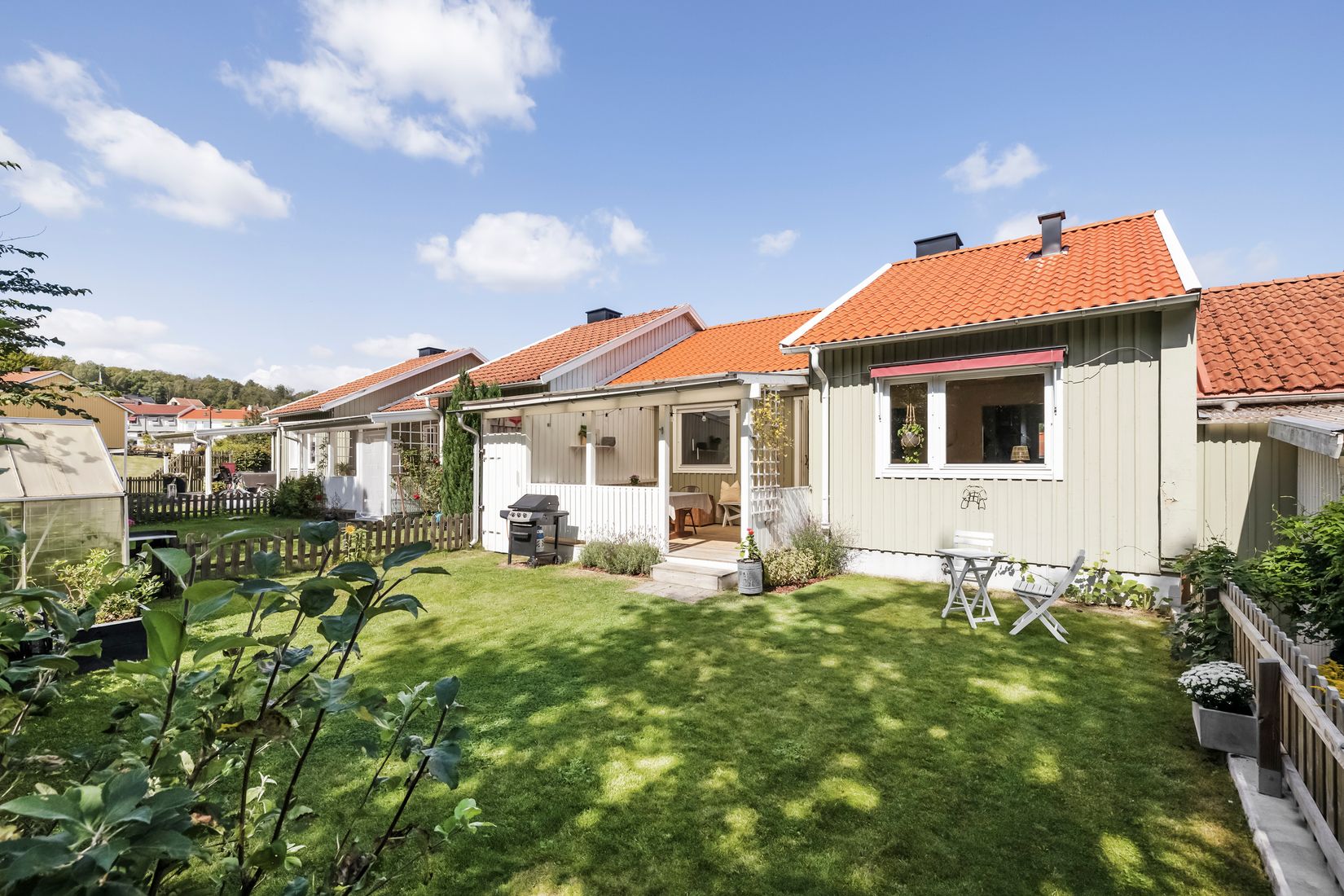 Tomten är lättskött och genomtänkt med både fram- och baksida. Baksidan är insynsskyddad och inramad av grönska med plana gräsytor, bärbuskar och ett charmigt växthus. Här finns även en generös altan med plats för utemöbler och sociala tillställningar. Framsidan är stenlagd och erbjuder ytterligare ytor för möbler, cyklar och umgänge. Tack vare husets placering kan man från de dubbla uteplatserna följa solen under hela dagen, från morgon till kväll. Nämnvärt är att radhuset ligger på gårdsläge, vilket innebär avsaknad av biltrafik utanför – istället angränsar en gång- och cykelväg, vilket gör vardagen lugn och trygg även för de yngre.
