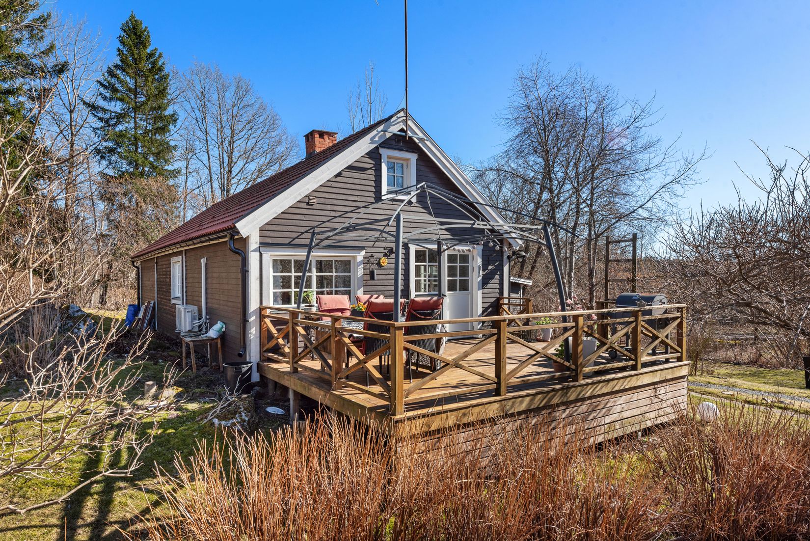 Den soliga tomten är en grön och insynsskyddad oas under sommartid då växtligheten skapar en privat och rofylld miljö. Här finns gott om utrymme för både avkoppling, odling och sociala tillställningar. Altanen blir en naturlig samlingsplats i solen, perfekt för långa middagar och sköna stunder. Ett lugnt läge där du kan njuta av stillheten och naturen runt omkring.