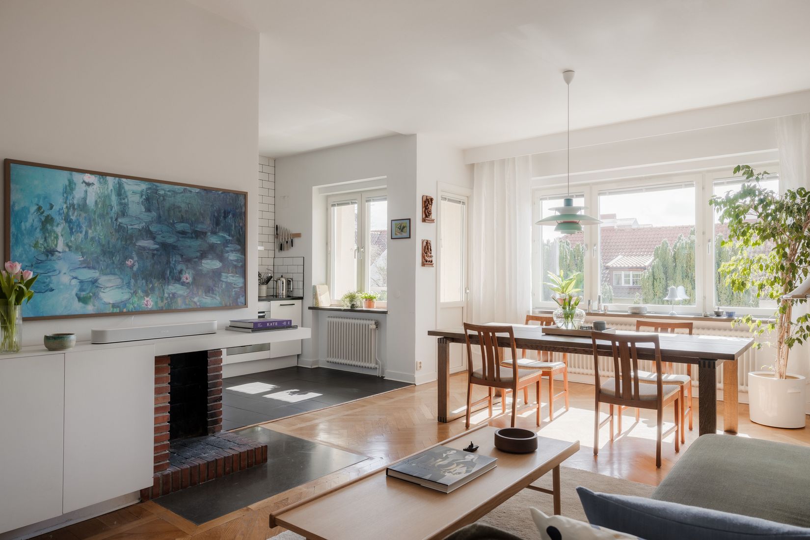 Både kök och badrum är smakfullt utformade med funktionella lösningar och moderna bekvämligheter. Sovrummet erbjuder generösa förvaringsmöjligheter i platsbyggda garderober, och vardagsrummet rymmer enkelt såväl soffgrupp som matplats. Den fungerande öppna spisen bidrar med en inbjudande atmosfär och blir en naturlig samlingspunkt i hemmet. Från vardagsrummet nås balkongen i soligt söderläge, där du kan njuta av solen från förmiddag till sen eftermiddag med en rogivande vy över området.