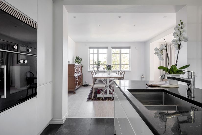 Entréplanet har en öppen planlösning , härliga sällskapsytor och ett gäst wc. Det nyrenoverade köket erbjuder generösa arbetsytor och en köksön med en påkostad stenskiva att samlas kring. Köket är utrustat med induktionshäll, fläkt, ugn, micro, diskmaskin samt kyl och frys i fullhöjd. Bredvid kök och matplats ligger vardagsrummet som blir den naturliga samlingspunkten. På ovanvåningen finner vi husets privata del med tre bra sovrum samt badrum. Från hallen finns trappan som leder upp till vindsplanet. I källaren finns tvättstuga, wc samt förråd.