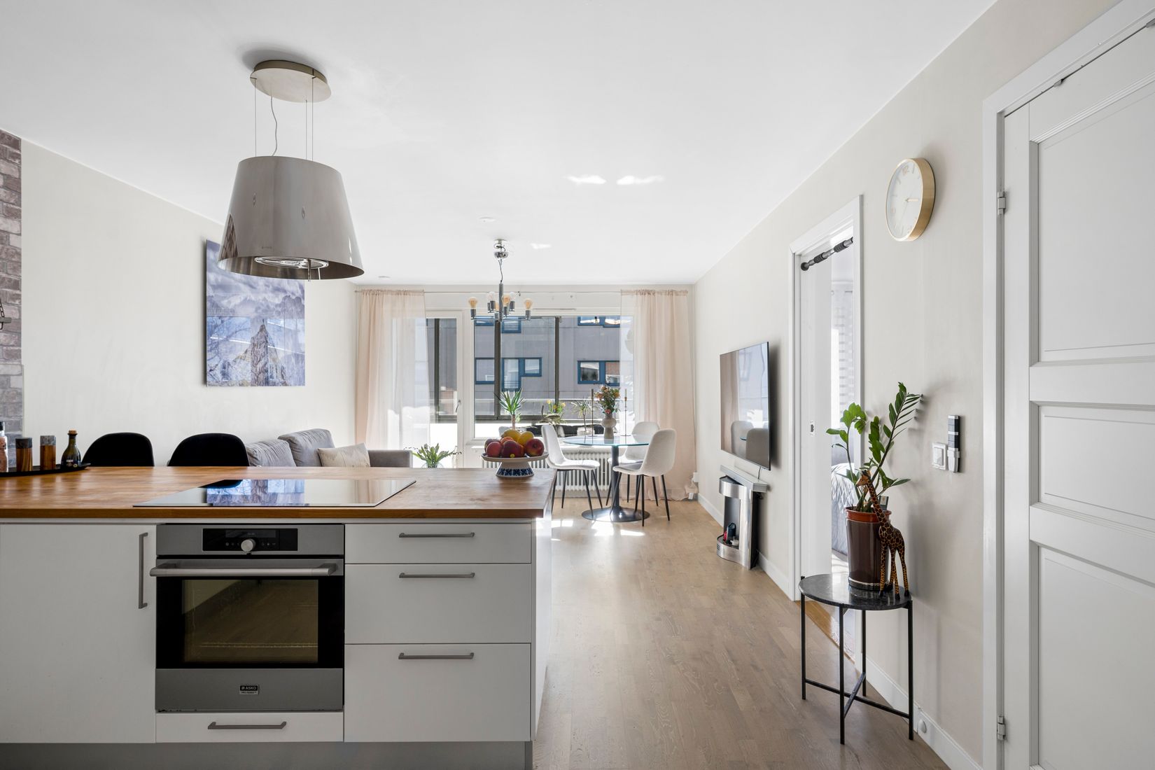 Bostaden präglas av en modern och öppen planlösning där kök och vardagsrum samspelar i en inbjudande och social yta. För den som önskar ytterligare rymd finns möjlighet att ta bort ett av sovrummen och istället skapa en generös matsal. Håltagning i den bärande väggen är redan utförd och kan enkelt öppnas upp på nytt vid behov – se alternativ planlösning. Det välutrustade köket i U-form erbjuder både funktion och stil, med integrerade vitvaror, vinkyl och en naturlig bardel som bjuder in till umgänge men även fungerar som extra arbetsyta.