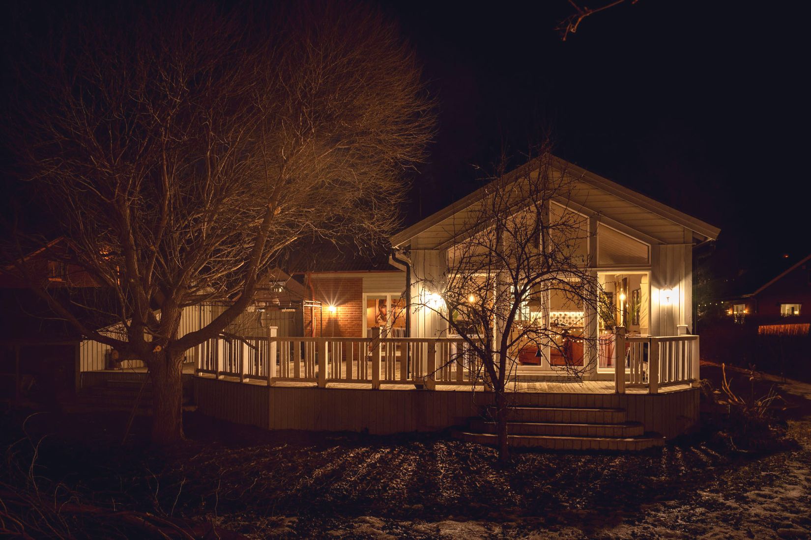Redan vid första anblick möts du av ett varmt och inbjudande uttryck. Kvällsljuset som speglar sig i de generösa fönsterpartierna avslöjar något mer än bara ett hus, här finns ett hem att trivas i året runt. Den stora tillbyggnaden från 2014 har skapat en fantastisk vardagsrumsdel där rymd och ljus får ta plats. Här suddas gränsen mellan ute och inne ut och via dubbeldörrarna kliver du rakt ut på den rymliga altanen. Altanen är en naturlig samlingspunkt under såväl sommarens sena kvällar som vinterkvällar i det nedsänkta spabadet.
