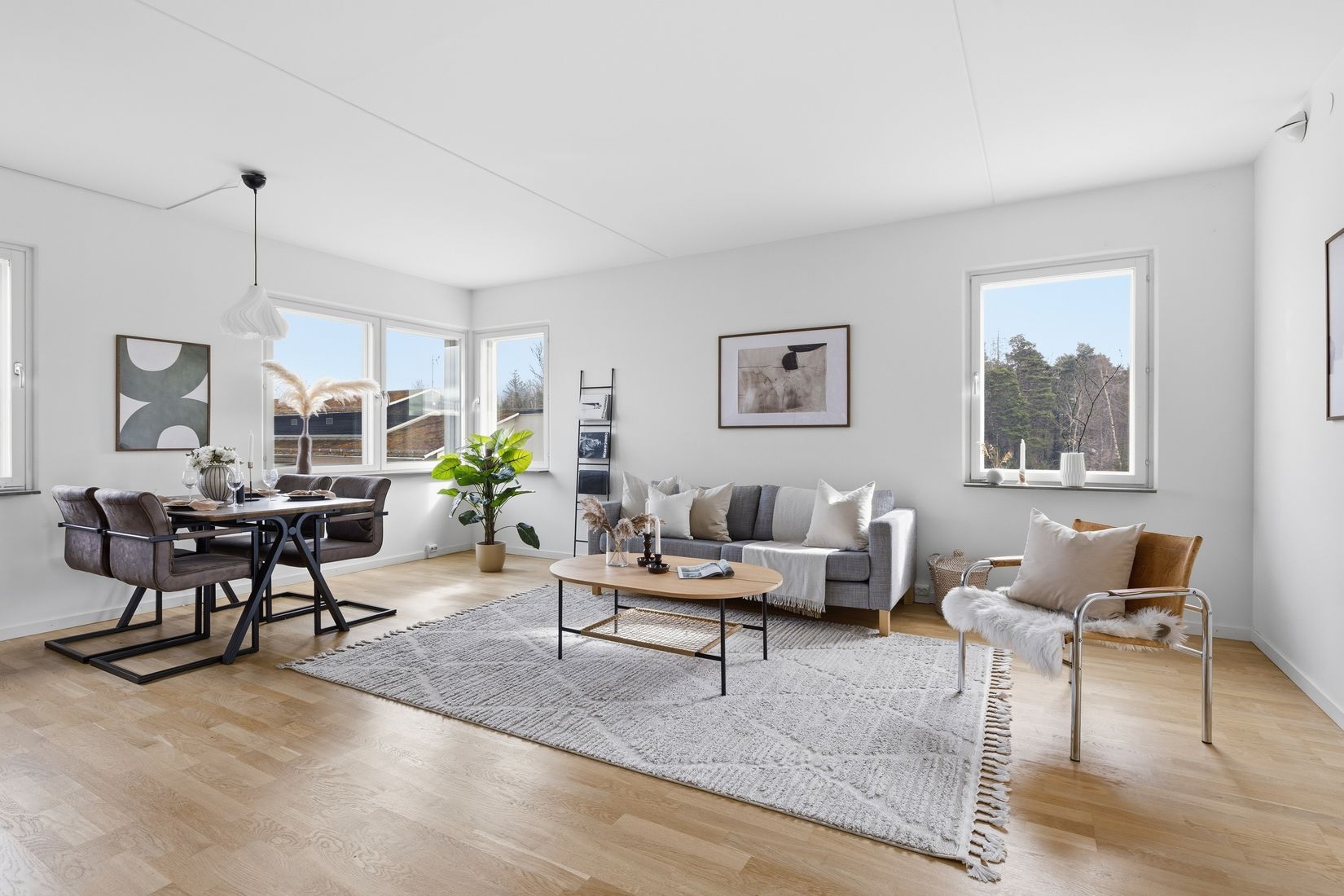 Vardagsrummet har ett generöst ljusinsläpp och direkt access till balkongen i soligt söderläge.
