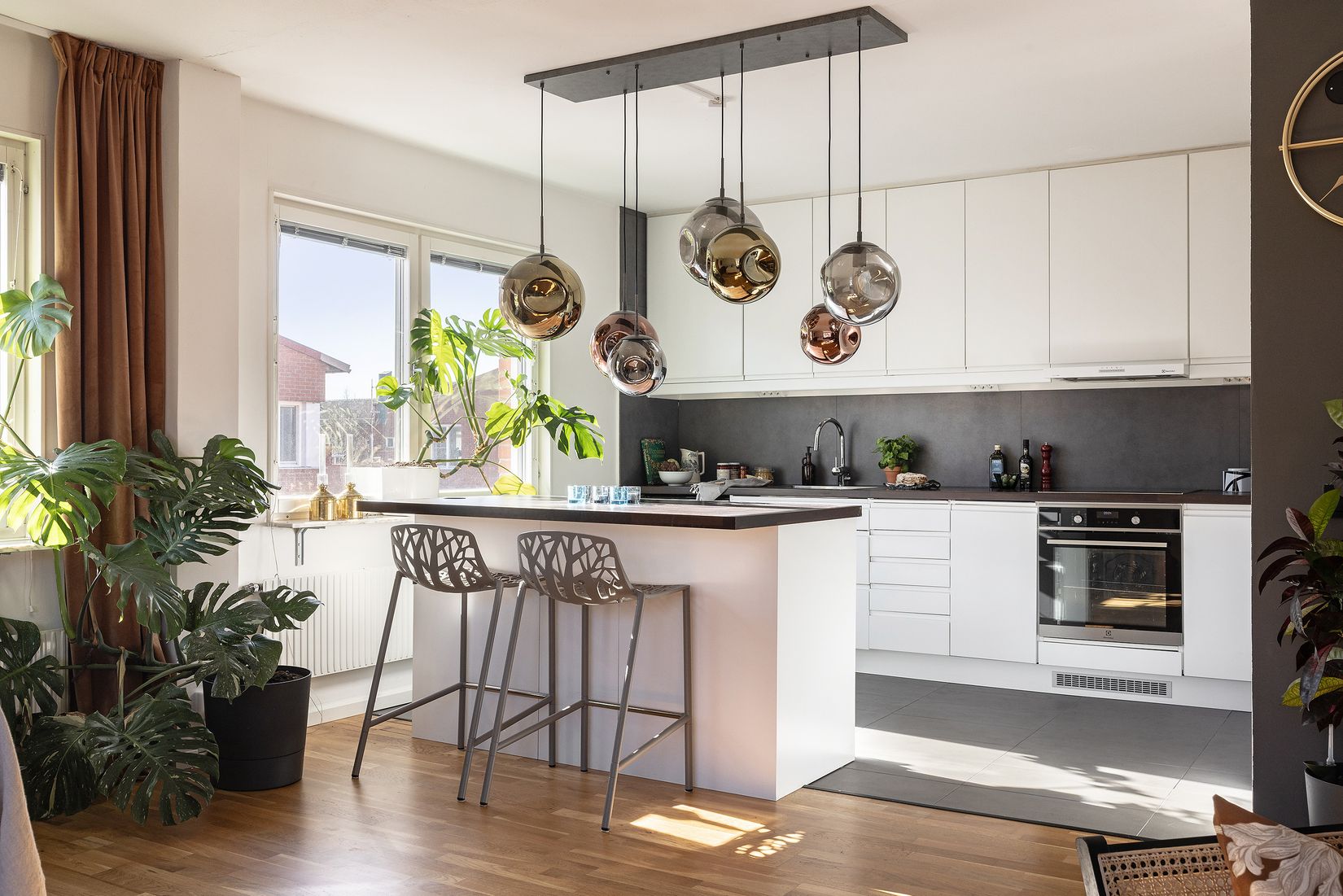 Bostaden är genomgående topprenoverad med smakfulla materialval och en modern, inbjudande känsla. Här erbjuds en optimal planlösning med sociala ytor och privata delar för hela familjen. Det moderna köket ligger i öppen planlösning mot vardagsrummet, vilket skapar en luftig och naturlig samlingspunkt för både vardag och fest. I köket finns köksö som erbjuder god extra arbetsyta, och den maskinella utrustningen består av spis/ugn, köksfläkt, diskmaskin, fullstor kyl och fullstor frys. De stora fönsterpartierna ger ett härligt ljusinsläpp och förstärker den rymliga känslan. I vardagsrummet finns plats för soffa, soffbord, TV-möblemang samt stor matplats för ca 6-8 personer.