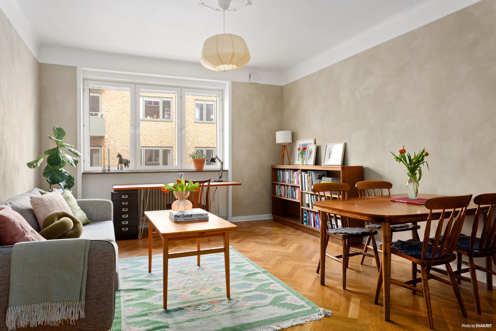 Nu har vi det stora nöjet att presentera denna charmiga 2.5:a på optimalt läge nära Möllan och Folkets park. Här bor man på charmiga 52 kvadrat med fina detaljer såsom fiskbensparkett, lampstuckatur, plankgolv och generös takhöjd. Kök med matplats för dig och några vänner, helkaklat badrum med badkar, sovrum med gott om plats för dubbelsängen samt gott om förvaring i form av en separat klädkammare och extra garderober som är placerade i "halvan" i mitten av lägenheten. Under sommarmånaderna nyttjar man med fördel föreningens härliga och gröna innergård, en egen oas mitt i stan. BRF Cirkeln är en välskött förening som bildades redan 1936. Föreningen äger marken, låg belåning och de stora renoveringarna gjorda.