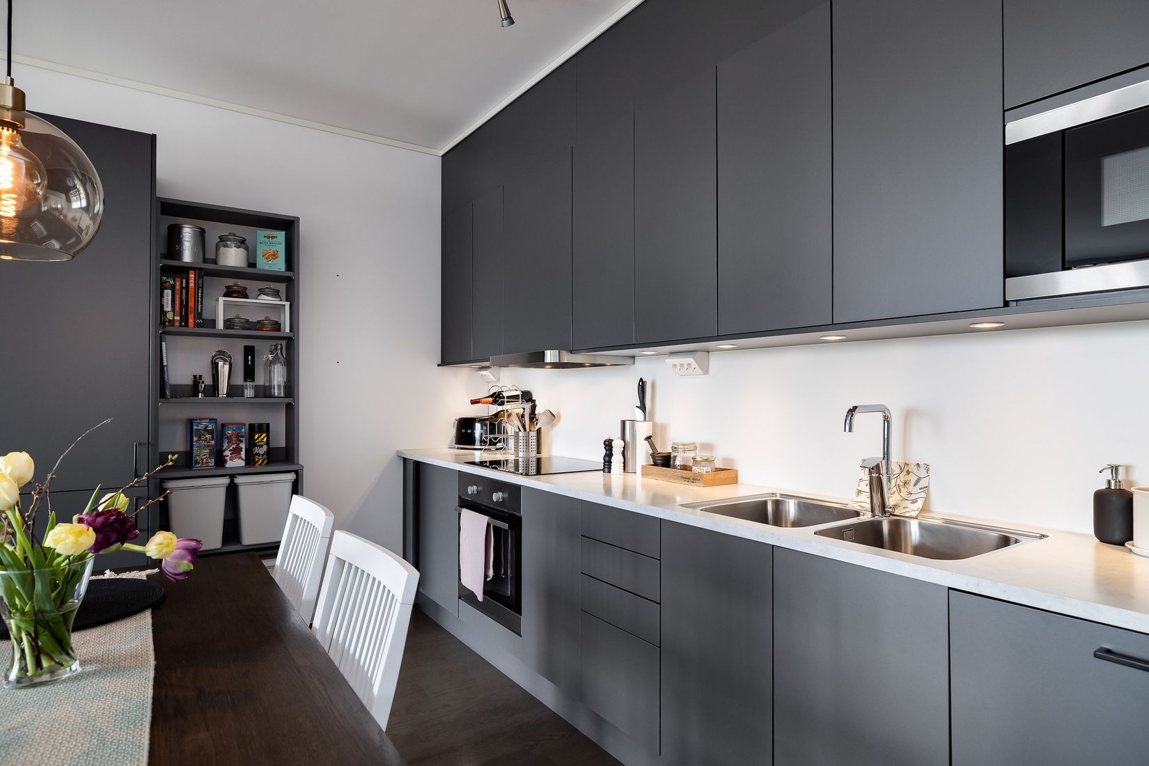 En mycket välplanerad och smakfull lägenhet med påkostade materialval. Smakfullt kök i grått med full maskinell komfort, ett badrum med hotellfeeling och två sovrum varav det ena har direkt anslutning till walk-in-closet! Från vardagsrummet nås den charmiga balkongen som erbjuder morgonsol!