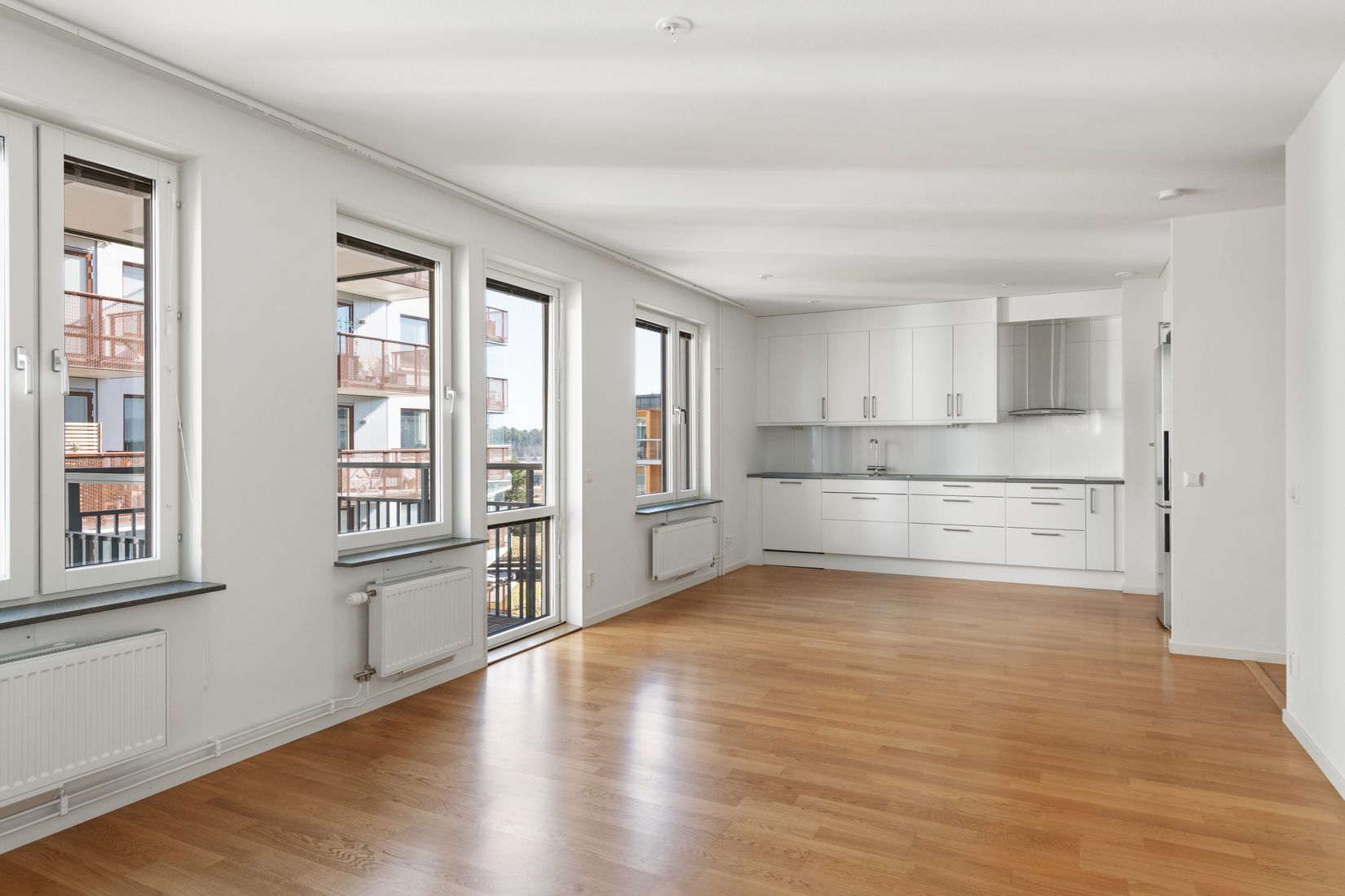 Det öppna och fräscha köket med bänkskiva i laminat, släta luckor, vita skåpluckor och öppen planlösning mot vardagsrummet ger en social känsla till bostaden. Här finns induktionshäll, diskmaskin, fläkt och kombinerad kyl/frys. Vardagsrummet är öppet och lättmöblerat med fint ljusinsläpp, stora fönster och plats för soffa och matgrupp.