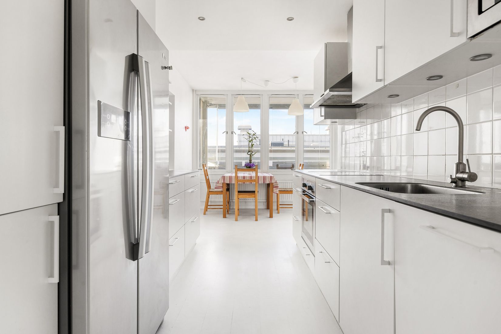 Redan när du kliver in möts du av en välkomnande hall där stengolv övergår i vitmålad parkett och skapar en stilren kontrast. Lägenheten präglas genomgående av ljusa ytskikt, stora fönsterpartier och en luftig planlösning som gör att bostaden känns både större och mer inbjudande.