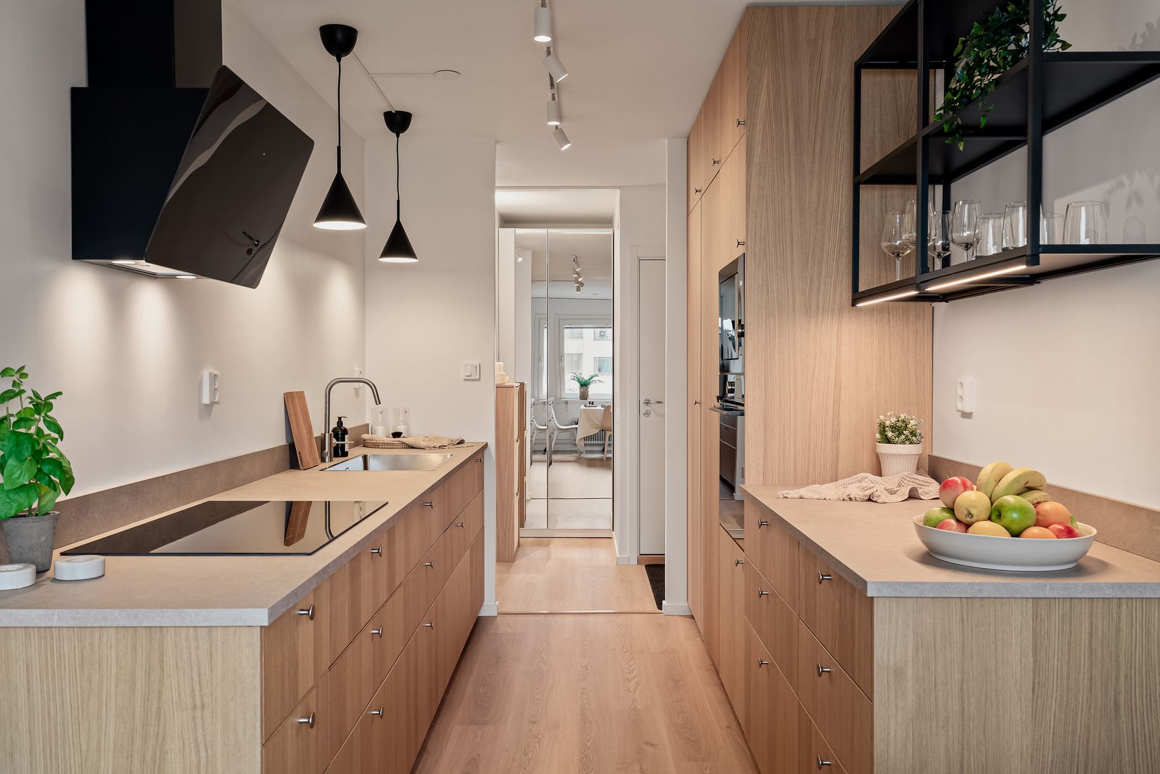 Lägenheten har smakfulla och moderna materialval, med genomgående ljusa golv och vitmålade väggar.