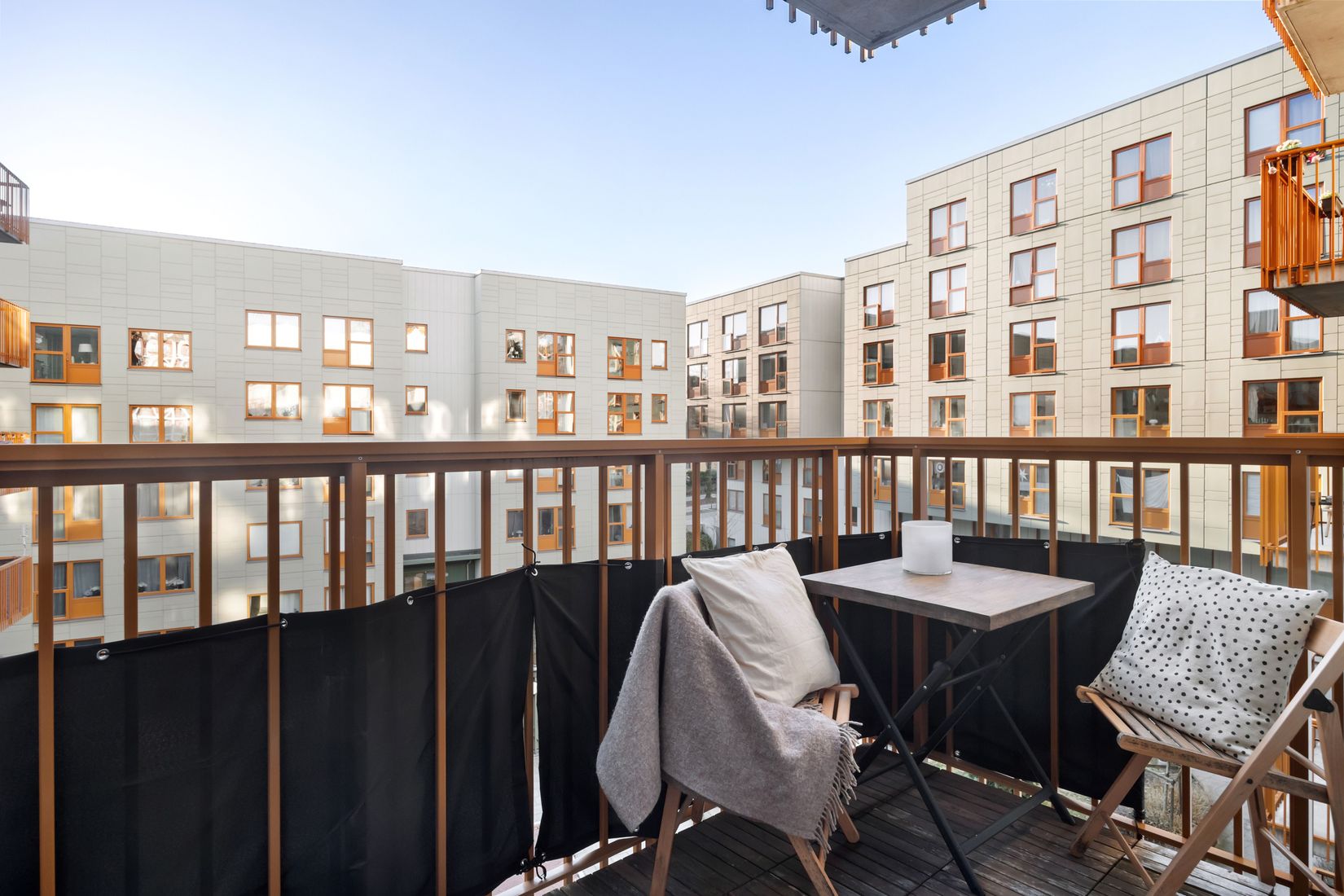 Balkongen är en lugn, solig och grönskande oas med utsikt mot innergården. Här kan du starta morgonen med kaffe eller avrunda dagen med ett glas på kvällen.