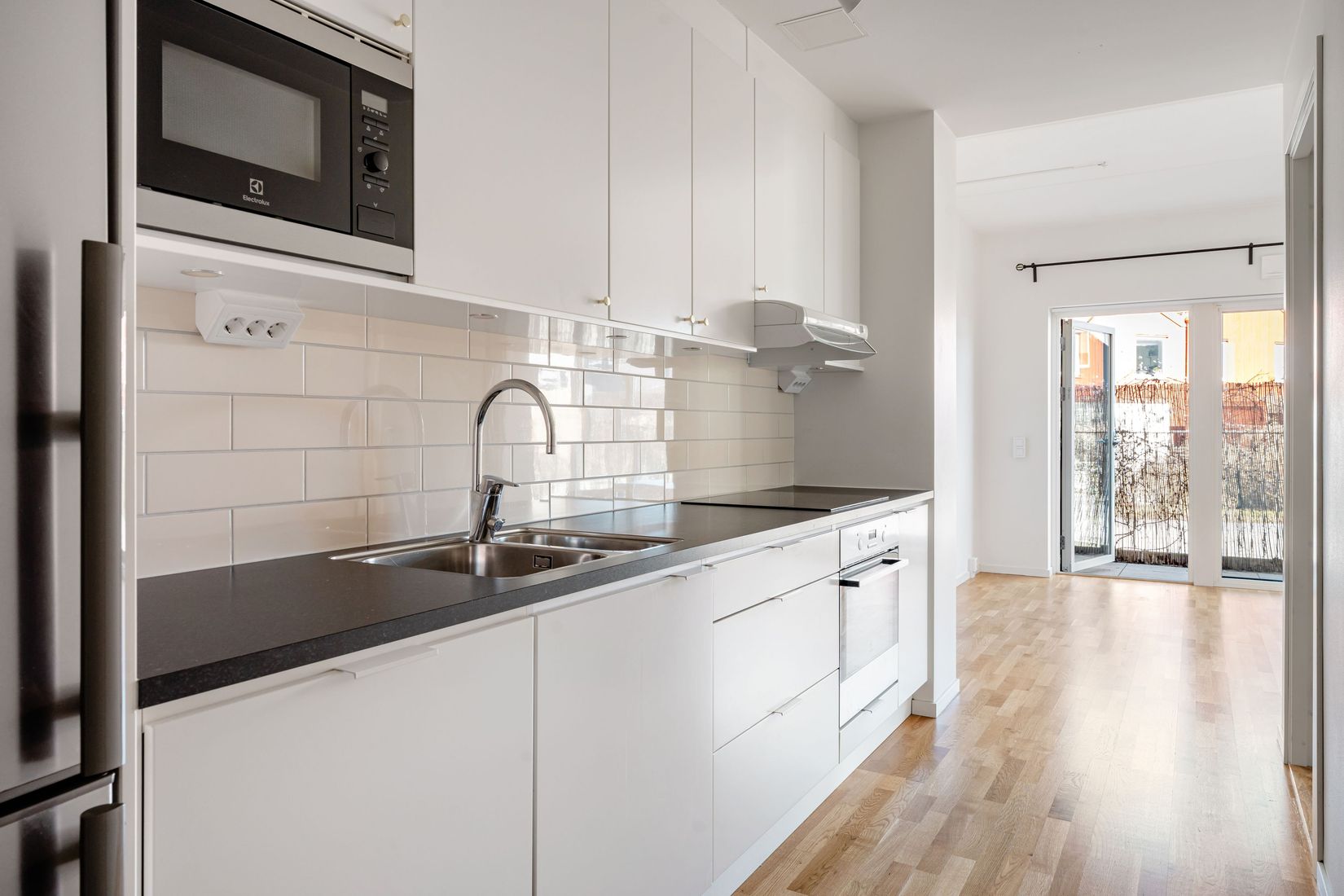 När du kliver in i lägenheten möts du av en öppen och ljus atmosfär. Stora fönster som släpper in generöst med naturligt ljus och skapar en härlig känsla av rymd. Rymligt vardagsrum med plats för möblemang efter eget önskemål. Här finns gott om plats för familj och vänner. Det moderna köket är stilrent och praktiskt utformat. Här finns gott om förvaringsutrymme och arbetsytor som underlättar för matlagningen. Köket är utrustat med moderna vitvaror. Badrummet är stilrent och modernt. Utrustat med bekvämligheter som en dusch, handfat och toalett samt tvätt -och torkmaskin. Sovrummet är rymligt och välkomnande med plats för en stor säng samt förvaringsmöbler.