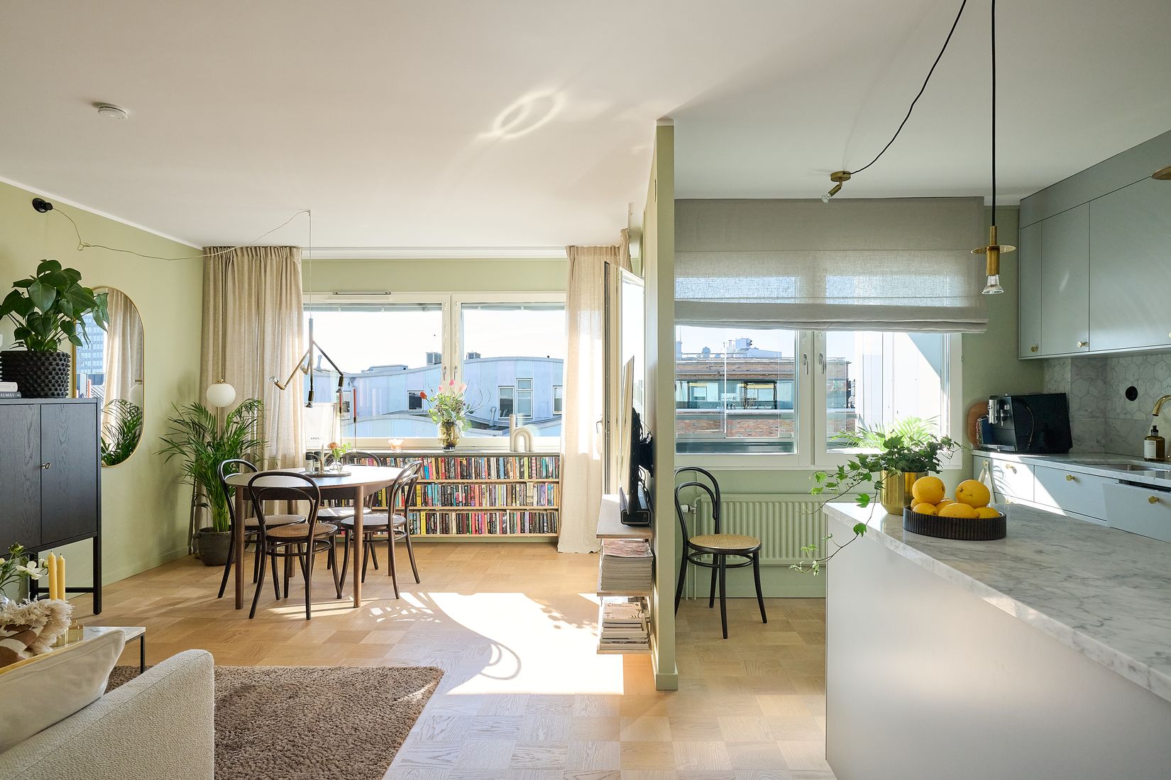 Med högt läge på 7 trappor ligger denna väldisponerade och mycket smakfullt renoverade lägenhet med magiskt ljusinsläpp och utsikt i väster. Öppen planlösning mellan vardagsrum och kök ger utrymme för socialt umgänge. Den praktiska och snygga köksön binder ihop delarna på ett fint sätt. Balkong i högt västerläge där du njuter av eftermiddags- och kvälssolen. Utmärkt förvaring i lägenheten med platsbyggda garderober och klädkammare.