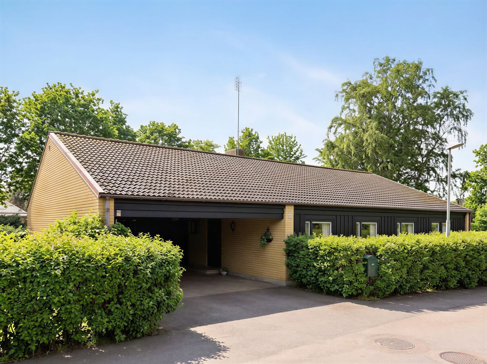 Den generösa hörntomten om 1 045 kvadratmeter bjuder på gräsmatta, uteplats med många soltimmar, carport, förråd och lekstuga. Med närhet till skog, Hembygdsparken, hav och goda kommunikationer.