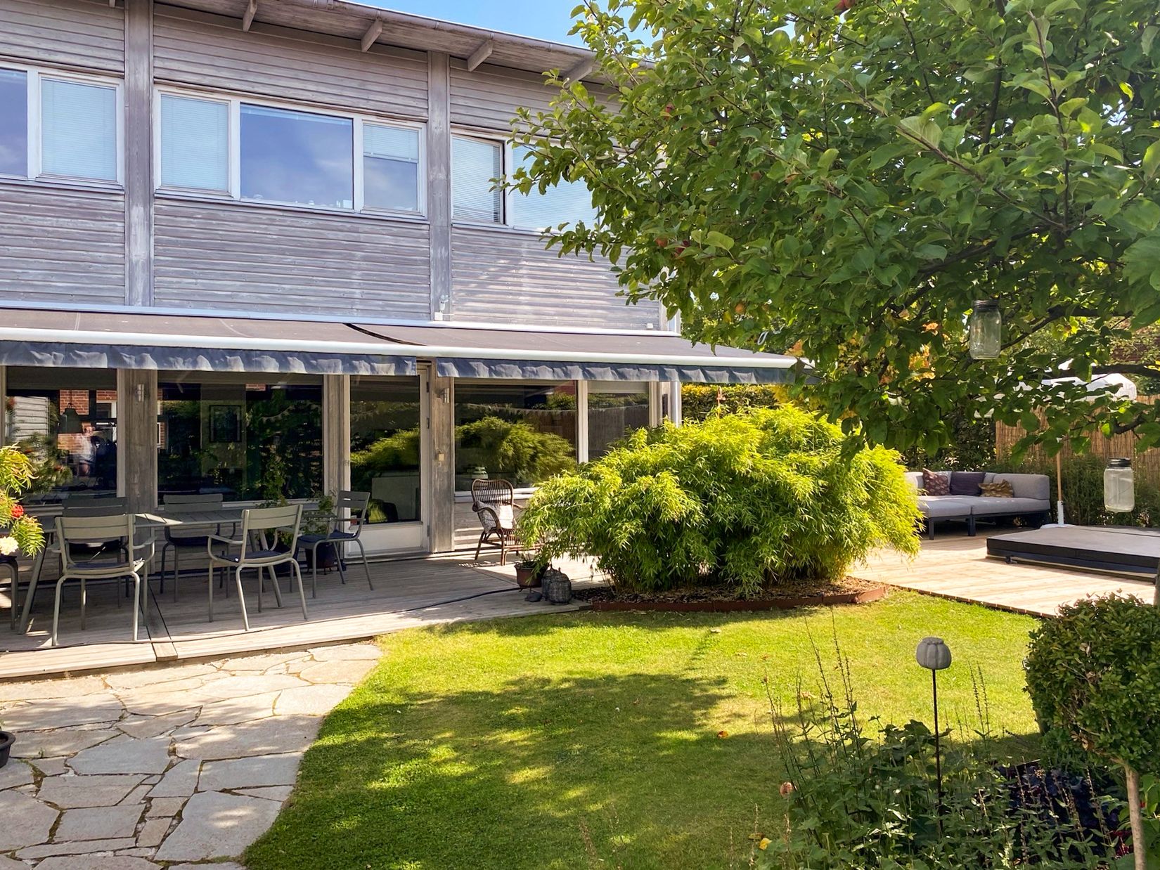 Utomhus har ägarna lagt stor omsorg på att skapa en trädgård att njuta av. Stort trädäck, skiffergångar och ett nedgrävt spabad från 2021 ramar in en vacker utemiljö med flera väldefinierade "rum" i trädgården. Den stora markisen gör att du kan njuta av uteplatserna även under soliga dagar och dessutom hålla huset svalt och begagligt. På tomten finns också ett förråd samt en uppfart med plats för två till tre bilar och elbilsladdare.