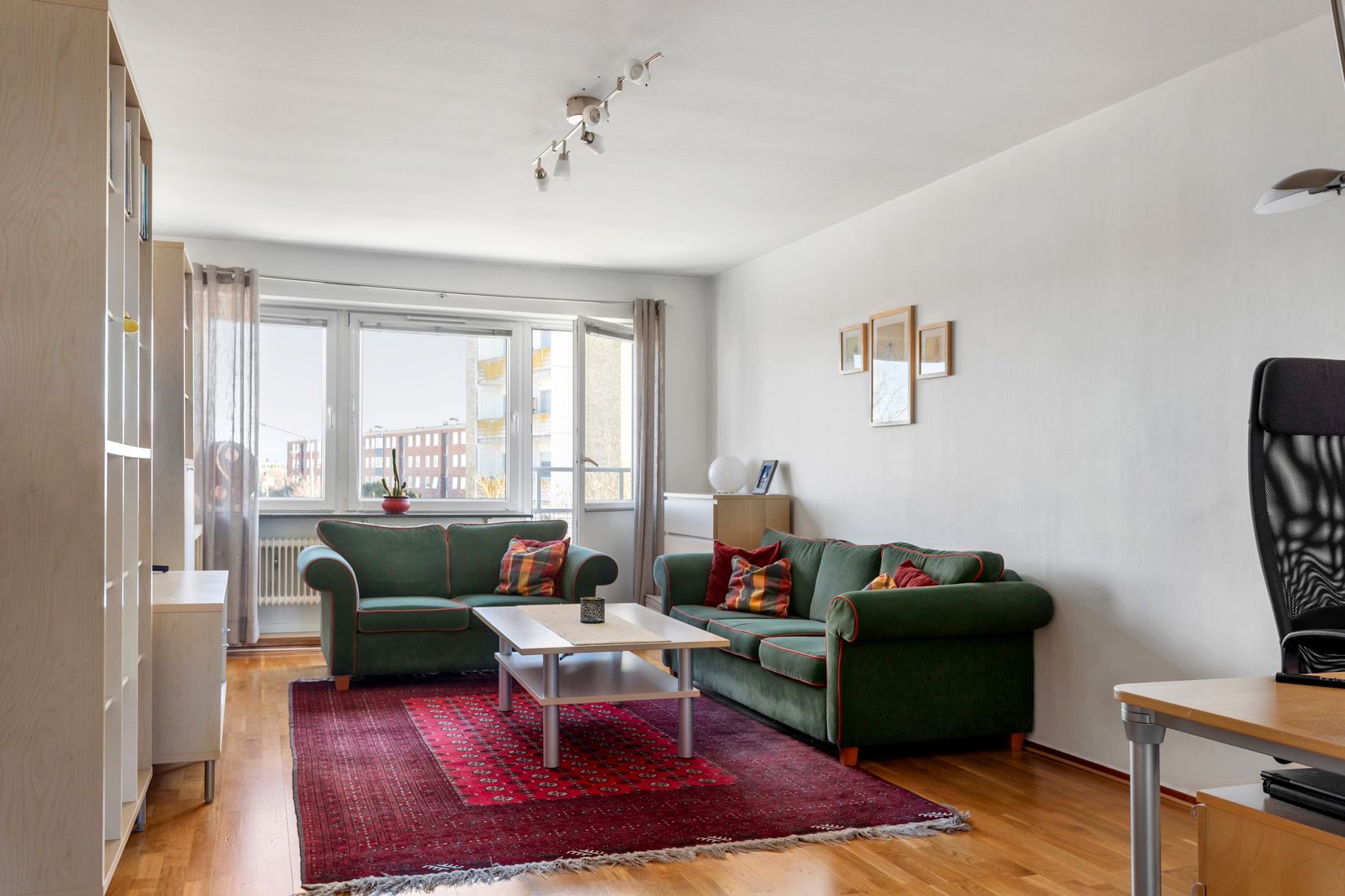 Vardagsrummet är rymligt och ljust, med parkettgolv, vita väggar och en charmig fransk balkong som släpper in rikligt med dagsljus. Sovrummet rymmer en stor dubbelsäng och garderob, med direkt utgång till den inglasade balkongen i västerläge - perfekt för soliga eftermiddagar och kvällar.
