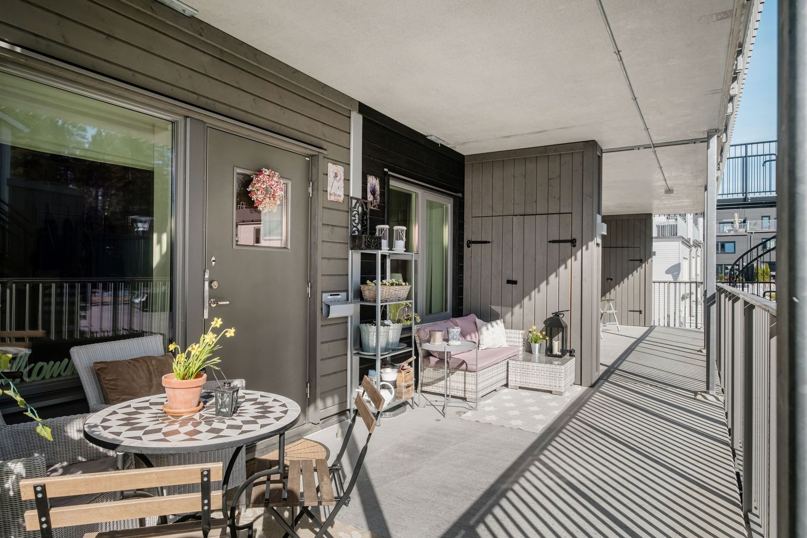 Bostaden erbjuder även fina utomhusytor med både uteplats vid entrén och en balkong i två olika vädersträck. Loftgången blir en perfekt plats för morgonsolen, medan balkongen erbjuder sol från eftermiddag till kväll – en lyx för den som älskar ljus och värme.