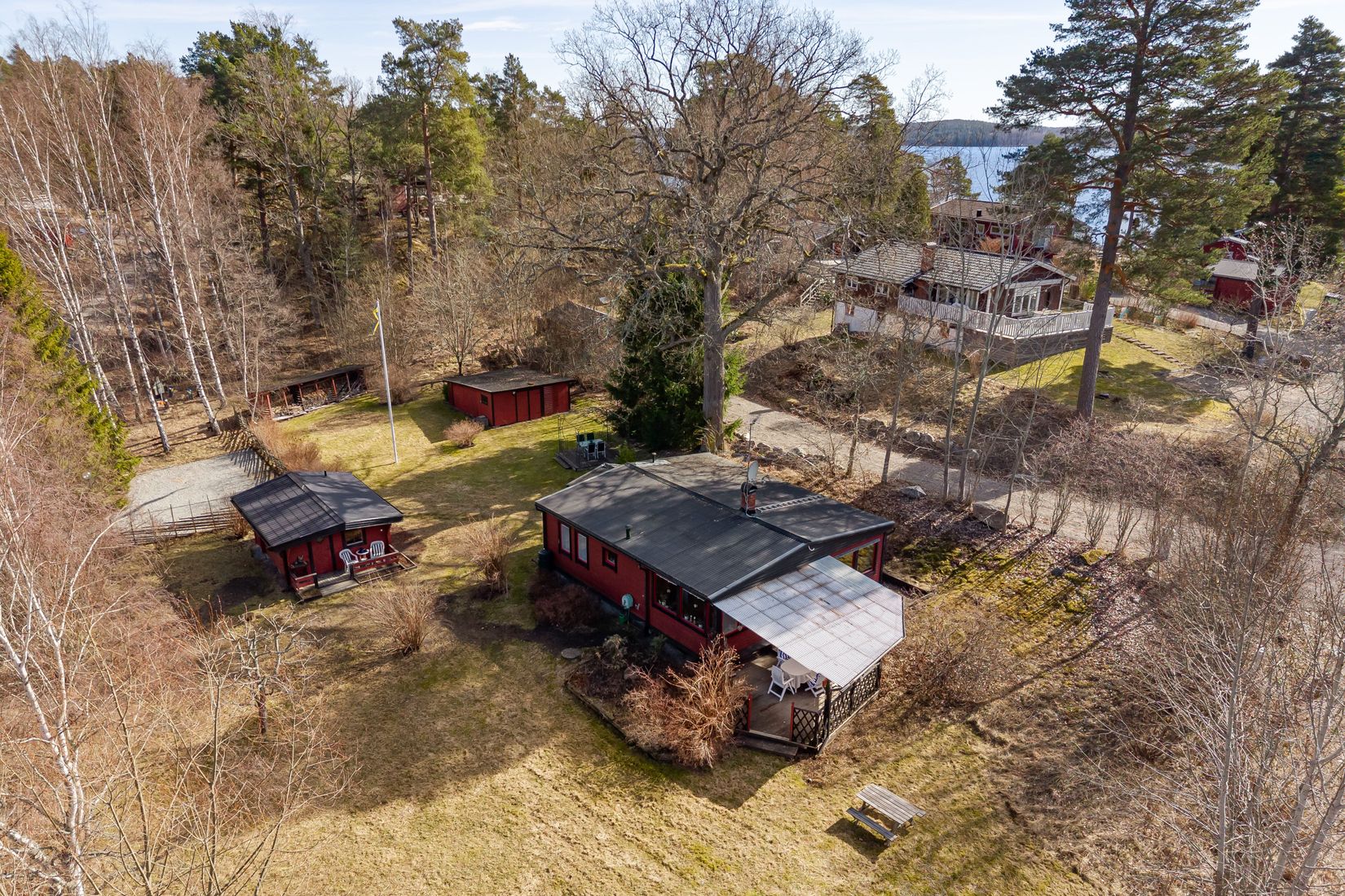 Inbjudande trädgårdstomt som badar i sol hela dagen. Här kan du njuta av avkopplande stunder i solstolen med rofyllt fågelkvitter som bakgrundsmusik. De böljande gräsytorna bjuder också in till fotbollsmatcher och kreativa utomhuslekar för stora och små. Vill man ta ett avsvalkande dopp mellan varven finns stranden och badbryggorna strax utanför grinden.