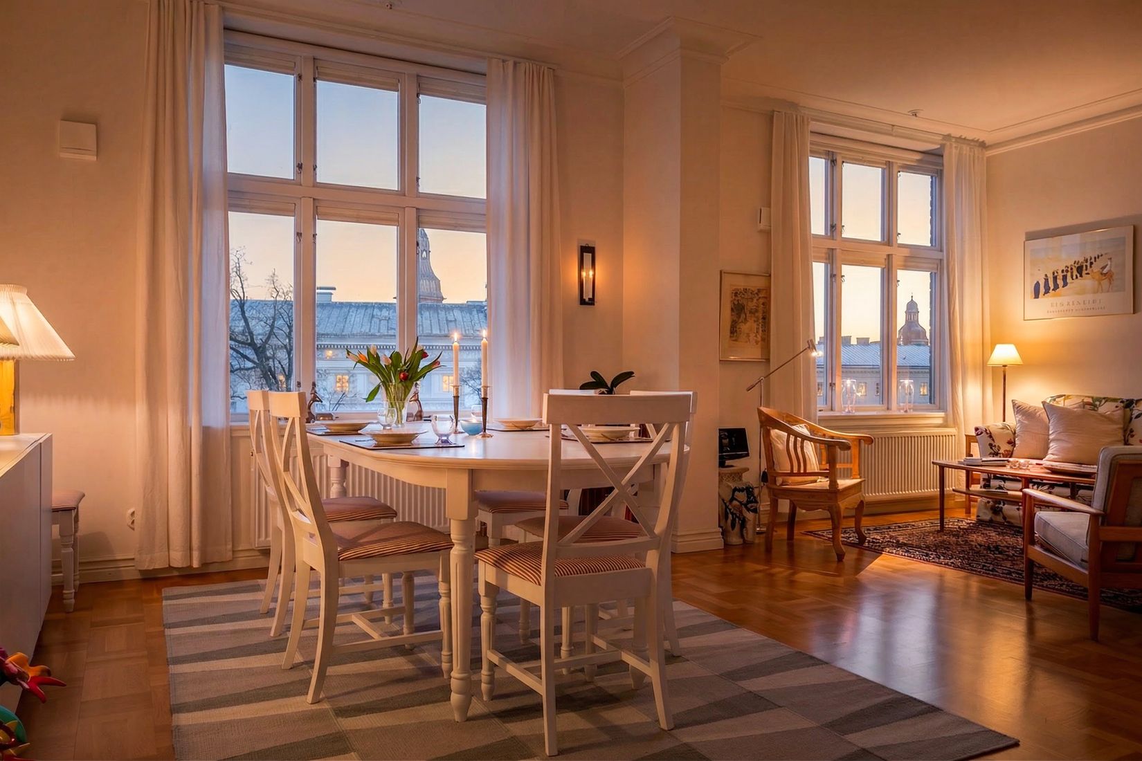 Lägenheten präglas av generös takhöjd, vackra proportioner och en luftig känsla genomgående. De sociala ytorna är smart disponerade i en öppen planlösning som på ett naturligt sätt delar upp rummet i tydliga sektioner för kök, matplats och vardagsrum, perfekt för både vardagsliv och umgänge. Här flödar ljuset in och skapar en varm och inbjudande miljö.