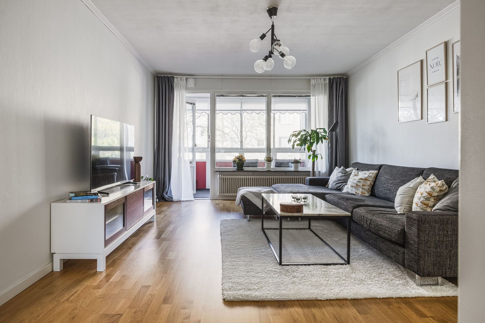 Lägenheten har en smart och funktionell planlösning. Hallen är välkomnande med goda avhängningsmöjligheter och ytterligare förvaring via garderober. Köket är stilrent och har bra förvaring. Här finns även en naturlig plats för matbord vid fönstret, vilket skapar en trevlig och social yta. Hemmets rymliga vardagsrum erbjuder gott om plats för både soffgrupp och matplats. De stora fönsterpartierna ger ett fint ljusinsläpp och härifrån nås även den inglasade balkongen – en härlig förlängning av vardagsrummet där du kan njuta av lugnet i ett insynsskyddat läge.