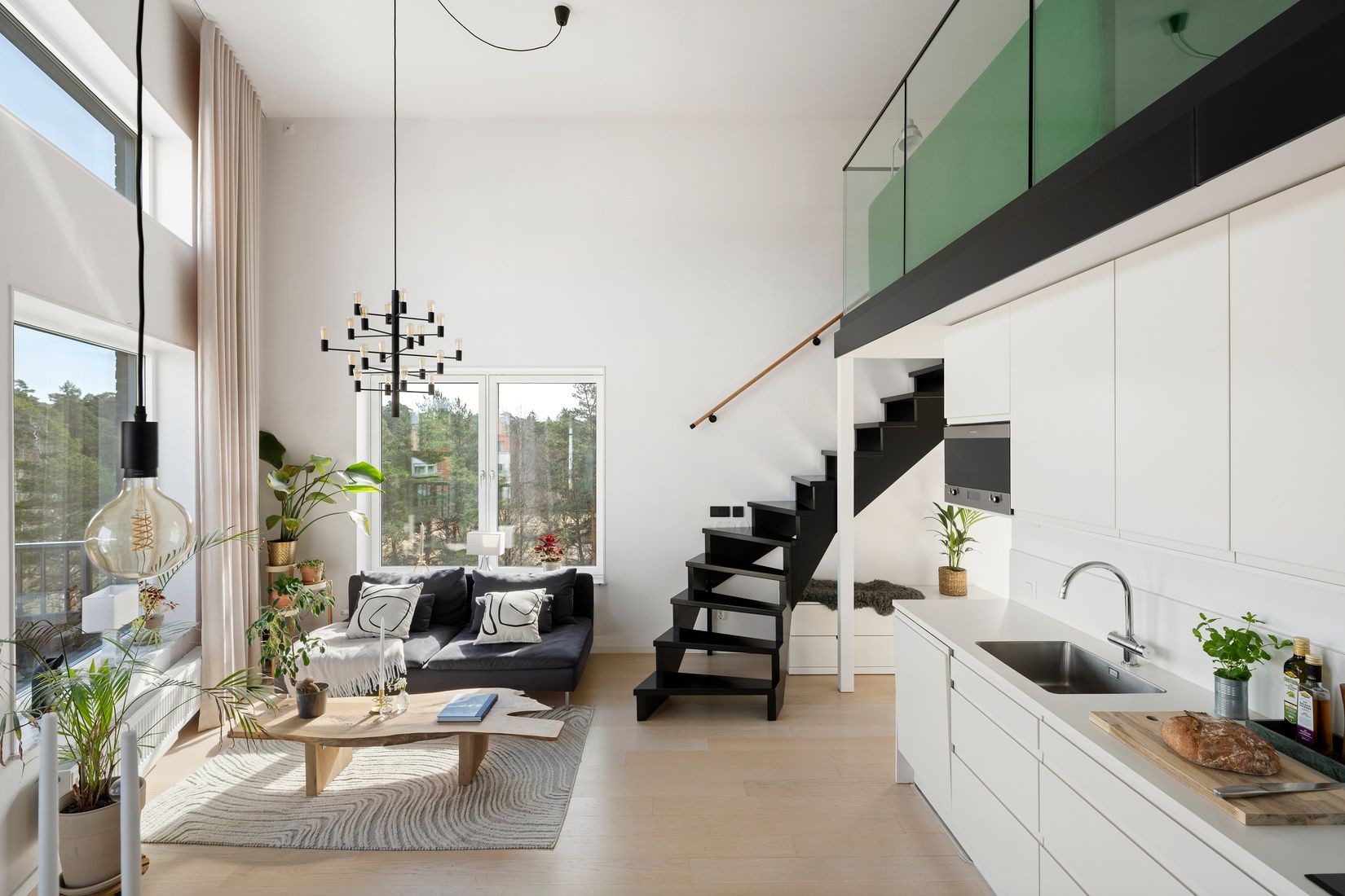 Här bor du med en öppen planlösning mellan kök och vardagsrum som ger en social och luftig känsla tack vare bostadens stora fönsterpartier och dess takhöjd om mer än 4 meter. Från vardagsrummet nås den ena balkongen om ca 6 kvm med morgon- och förmiddagssol. Köket från HTH har ljusa, släta luckor som ger ett stilrent intryck och intill finns plats för matgrupp. Badrummet erbjuder golv i carraramarmor, ljust kakel på väggarna samt en kombinerad tvättmaskin/torktumlare. Sovrummet på entréplan är rymligt och används idag som kontor med utgång till bostadens andra balkong med härlig kvällssol. Längs den häftigt kontrasterande trappan i svart tar man sig upp till den generösa ovanvåningen om ca 33 kvm i ståhöjd (ca 185cm). Den vackra glasväggen som löper längs med hela våningsplanet ger fri sikt ner till undervåningen. Ytan fördelar sig på en walk-in closet, ett allrum för tv-mys samt en sovrumsdel med ytterligare god klädförvaring tillsammans med en relaxhörna där kvällssolen kan avnjutas ovan takåsarna.