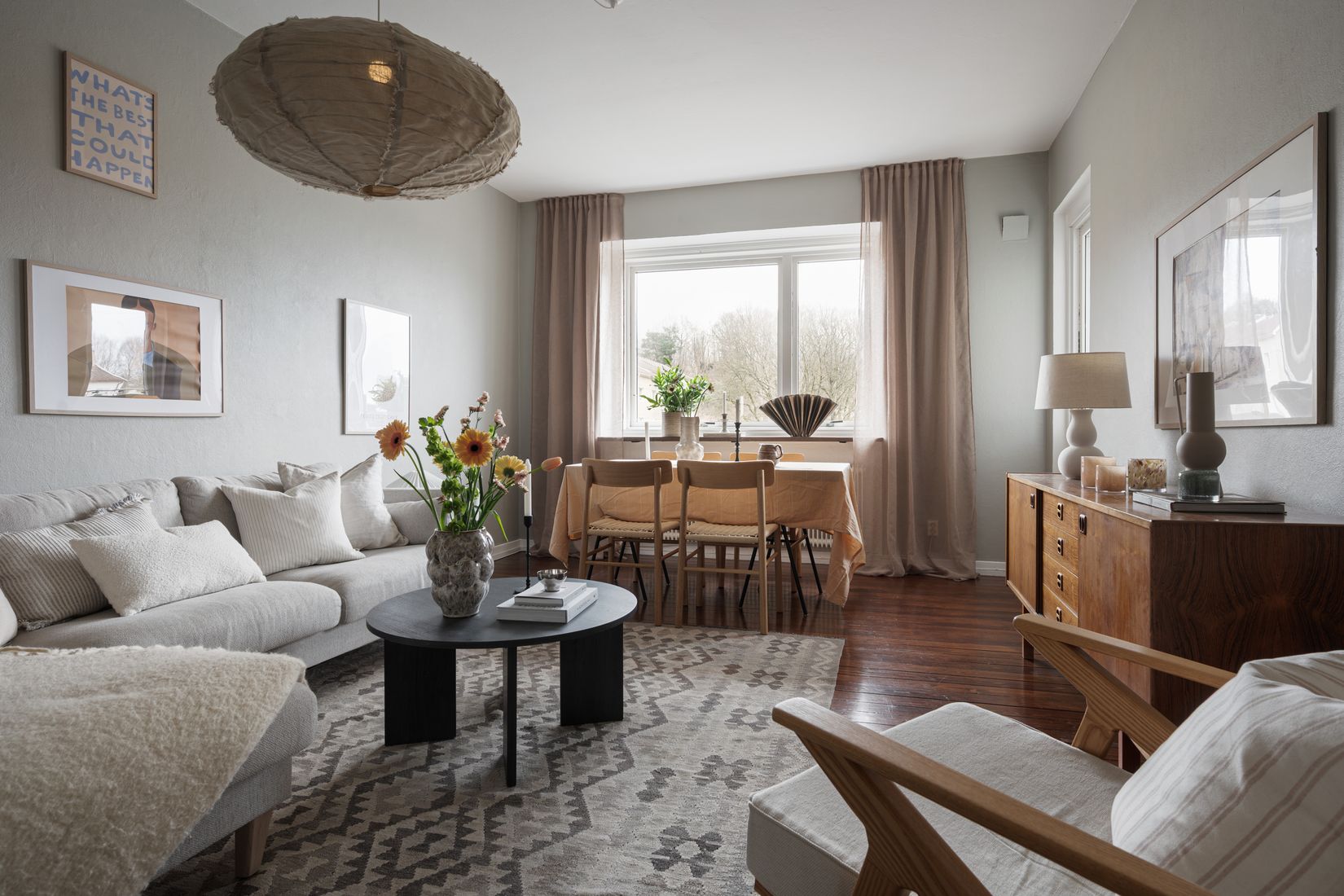 Här kliver du in i ett hem där ljuset strömmar genom generösa fönster och där planlösningen utnyttjar varje kvadratmeter på bästa sätt. Det rymliga vardagsrummet har gott om plats för både soffhörna och matgrupp. Härifrån når du balkongen i härligt söderläge, idealisk för morgonkaffet eller middagar i kvällssolen. Köket är välplanerat i härliga nyanser och bra med arbetsytor. Sovrummet erbjuder en lugn atmosfär och smart förvaring, medan badrummet har en rymlig dusch och ett vädringsfönster som höjer komforten. Hallen är inbjudande och knyter ihop bostaden med praktisk förvaring för ytterkläder och skor, och enhetligt brädgolv löper genom hela lägenheten.