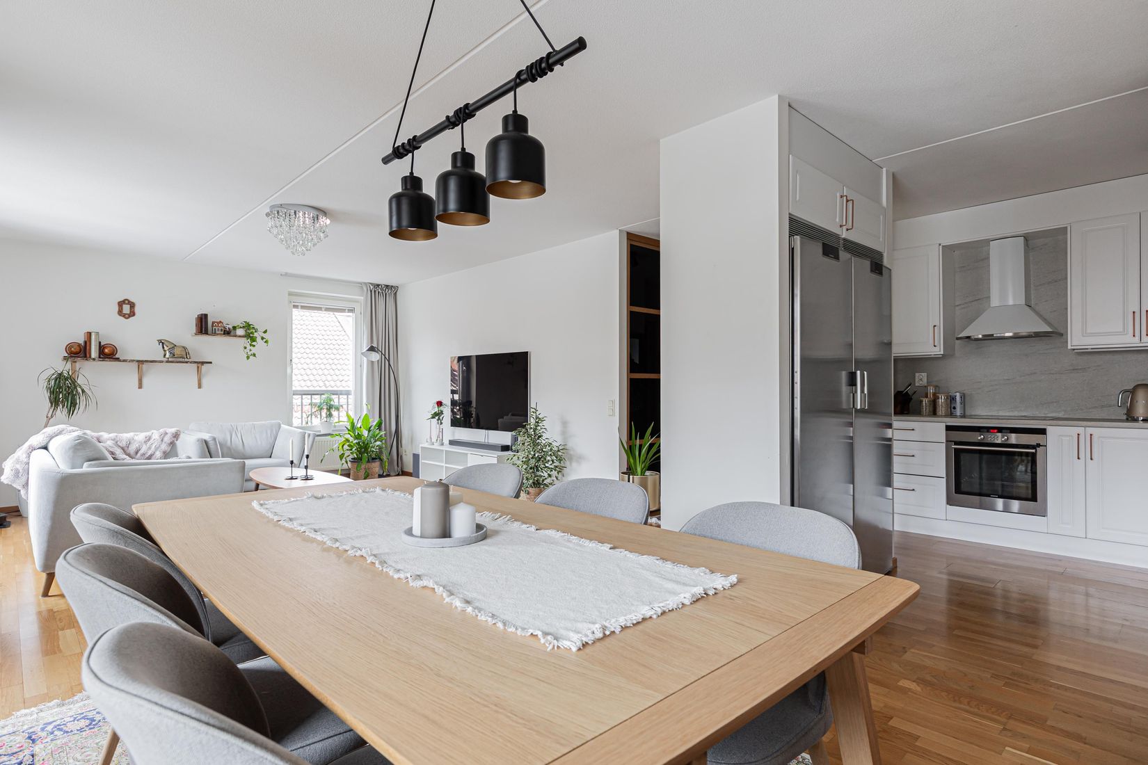 Det stilrena köket ligger i öppen anslutning till vardagsrummet och bjuder in till både vardagsliv och trevliga middagar med familj och vänner. Här finns gott om arbetsytor och förvaring, vilket gör köket både praktiskt och funktionellt.