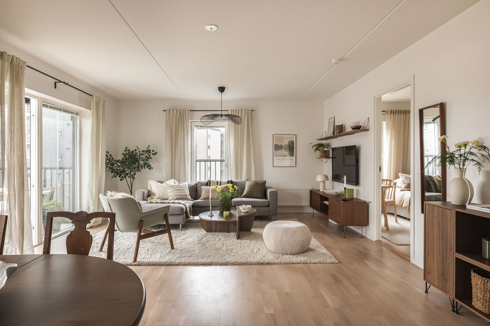 Den inglasade balkongen i soligt läge blir snabbt en favoritplats för hela familjen, med möjlighet att grilla med elgrill och njuta av långa, ljusa dagar. Från master bedroom finns en fransk balkong som ger extra ljusinsläpp och en luftig känsla. Som hörnlägenhet får hemmet fint ljus från flera håll, och säkerhetsdörren bidrar till en trygg boendemiljö.