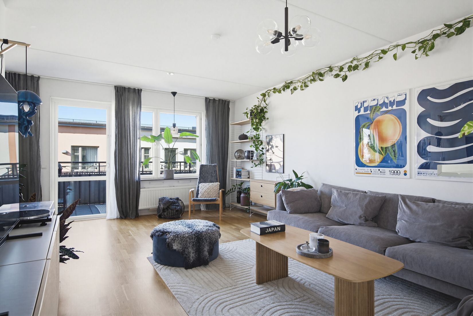 Det stilrena köket har vita luckor med infällda grepplister, rostfria vitvaror och generösa förvaringsmöjligheter. Här finns även en trivsam matplats intill fönster, med delvis öppen planlösning mot vardagsrummet. Vardagsrummet rymmer både matgrupp och soffgrupp och har utgång till den ena balkongen, där du kan njuta av ett fint ljusinsläpp och sol under större delen av eftermiddagen/kvällen.