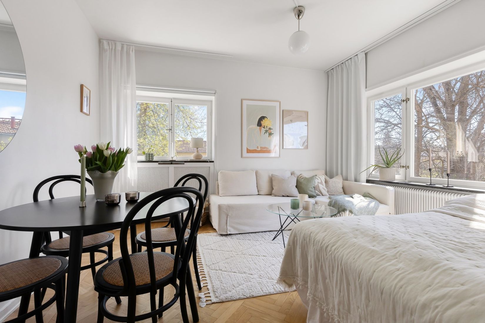 Lägenheten ligger i ett lugnt och avskilt läge längst in i huset, och håller genomgående god standard. Det rymliga allrummet är lättmöblerat och erbjuder plats för säng, soffgrupp, matbord och förvaring. De generösa fönsterpartierna tillsammans med den tilltagna takhöjden, vackra elementskydden och den klassiska fiskbensparketten bidrar till en ljus, stilren och luftig atmosfär. Köket är separat och välplanerat med smarta förvaringslösningar åt två håll samt ett fönster i söderläge som ger ett härligt ljus. Badrummet är rymligt och helkaklat, och bostaden erbjuder dessutom gott om praktiska förvaringsmöjligheter i hela lägenheten.