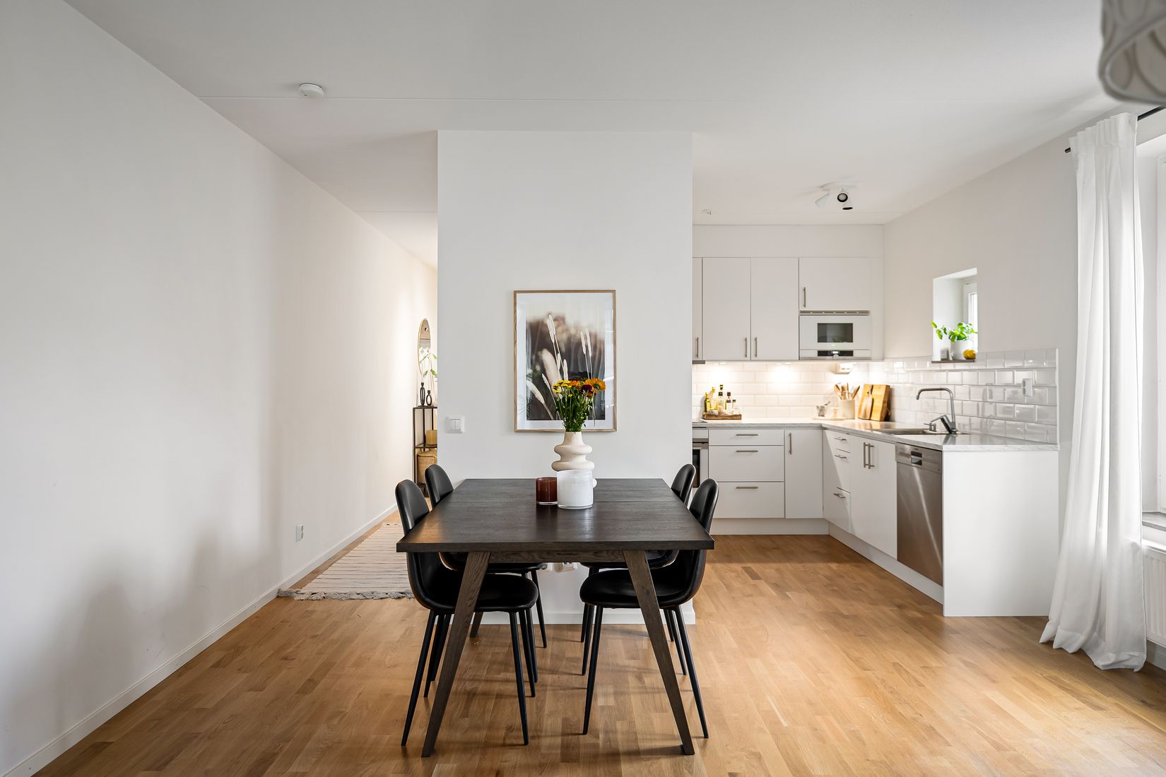 Det första man möts av i denna bostad är en stor och inbjudande hall med goda förvaringsmöjligheter. Köket har generösa arbetsytor, skåpluckor i vit kulör och plats för matbord och stolar. Lättmöblerat och stilrent vardagsrum med härliga umgängesytor och fint ljusinsläpp tack vare de stora fönsterpartierna. Genomgående parkettgolv i hela bostaden. Med golvvärme i badrummet kommer du alltid att känna dig varm och bekväm när du kliver ut ur duschen. En modern kommod ger dig gott om utrymme för alla dina badrumstillbehör. För totalbekvämlighet finns självklart även tvättmaskin och torktumlare på plats. Stort sovrum som har plats för dubbelsäng och annat möblemang. I anslutning till sovrummet finns det en stor klädkammare.