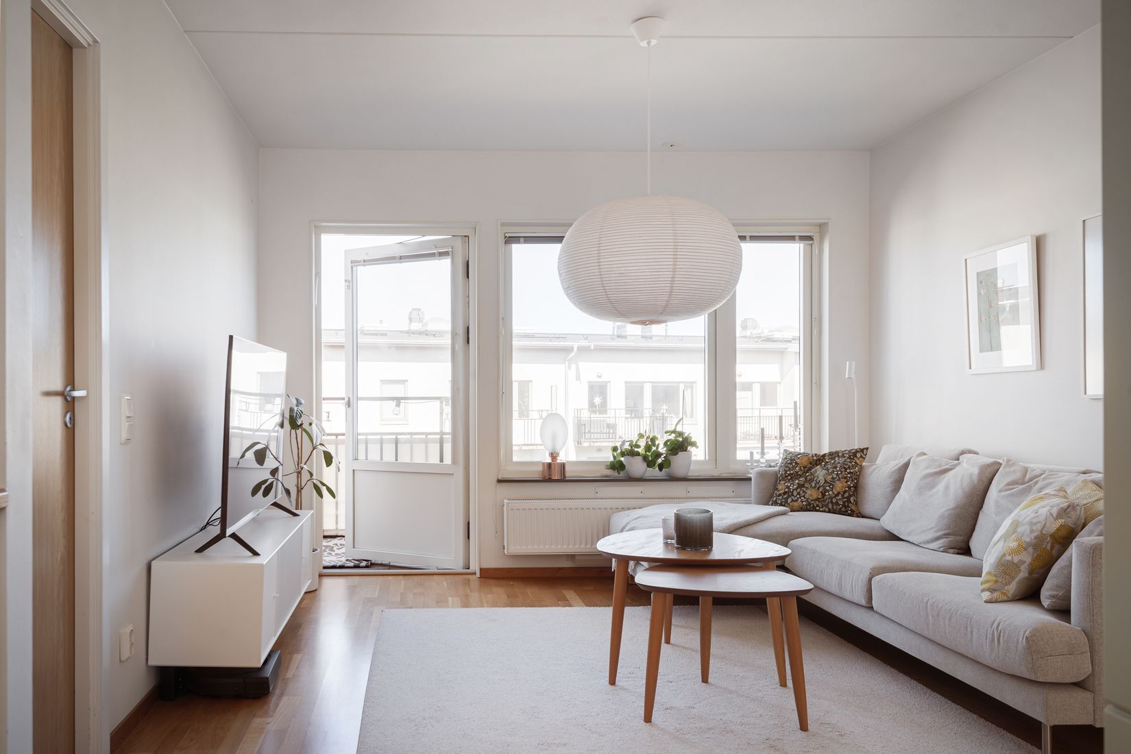 Det ljusa vardagsrummet bjuder in till sociala stunder och har utgång till en trevlig balkong som ligger i ett insynsskyddat läge. Här finns gott om plats för både loungemöbler och växter – en perfekt plats för avkoppling.