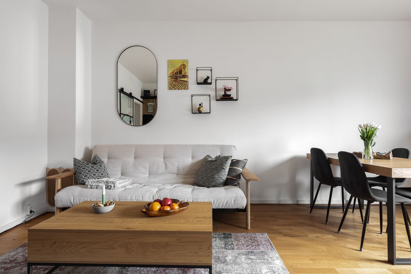 Här bor du i en välplanerad och rymlig lägenhet med modern stil och fräscha ytskikt i ett charmigt funkis-hus. Lägenheten präglas av ett härligt ljusinsläpp och bjuder dessutom på en fantastisk vy mot S:t Johanneskyrkan från sovrummet – en detalj som verkligen sätter guldkant på boendet.