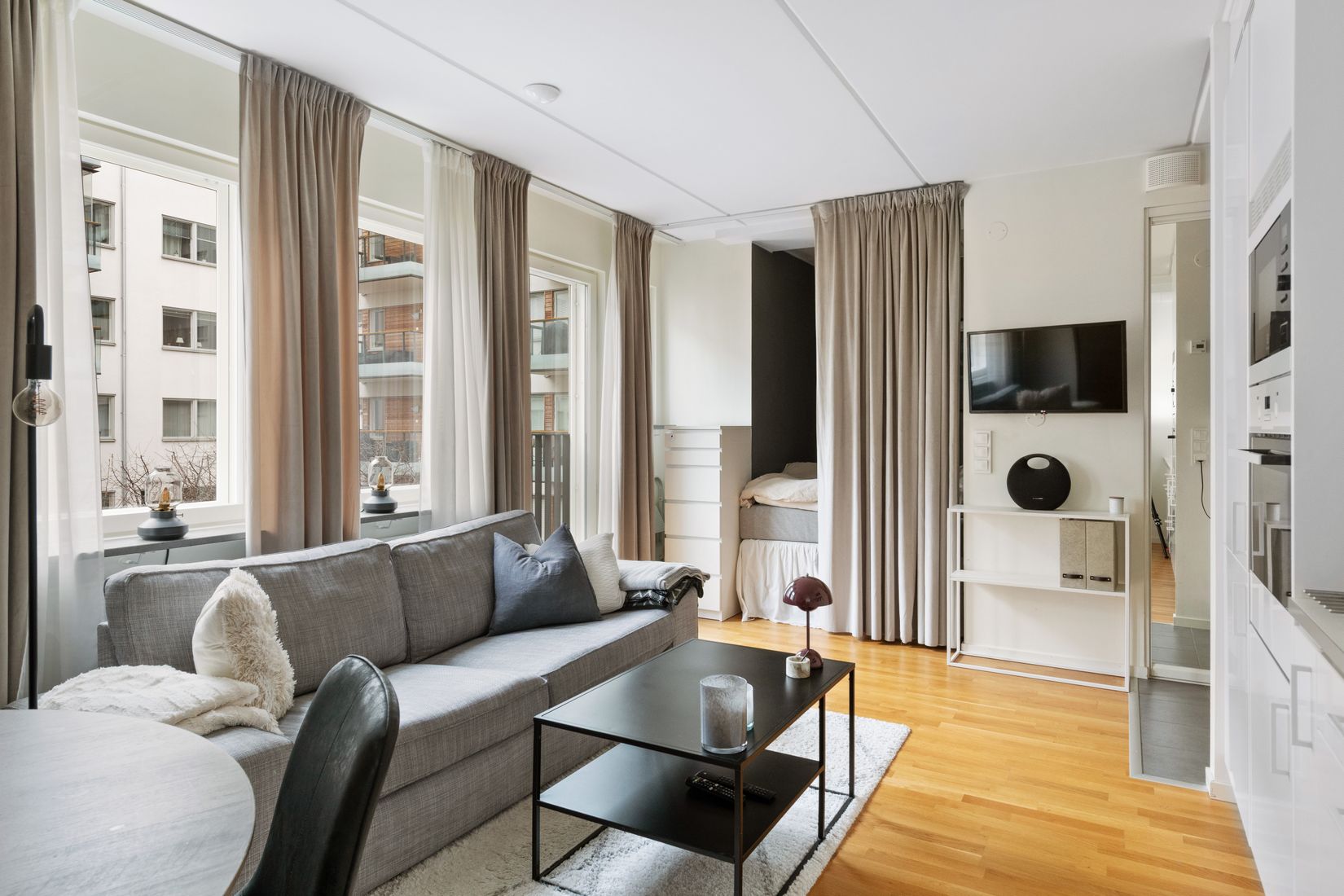 Den smart planerade sovalkoven ger en avskild och mysig sovdel, vilket gör att bostaden känns större än sina kvadratmeter.