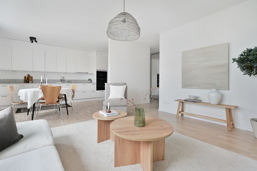 Välkomnande rymlig hall med plats för avhängning. Kök och vardagsrum i öppen social planlösning med fint ljusinsläpp med plats för matbord och soffhörna. Köket är välutrustat med fina material. Två lättmöblerade sovrum med bra förvaringsmöjligheter. Stor och trivsam balkong mot den mysiga innergården. Här finns plats för bord och stolar.