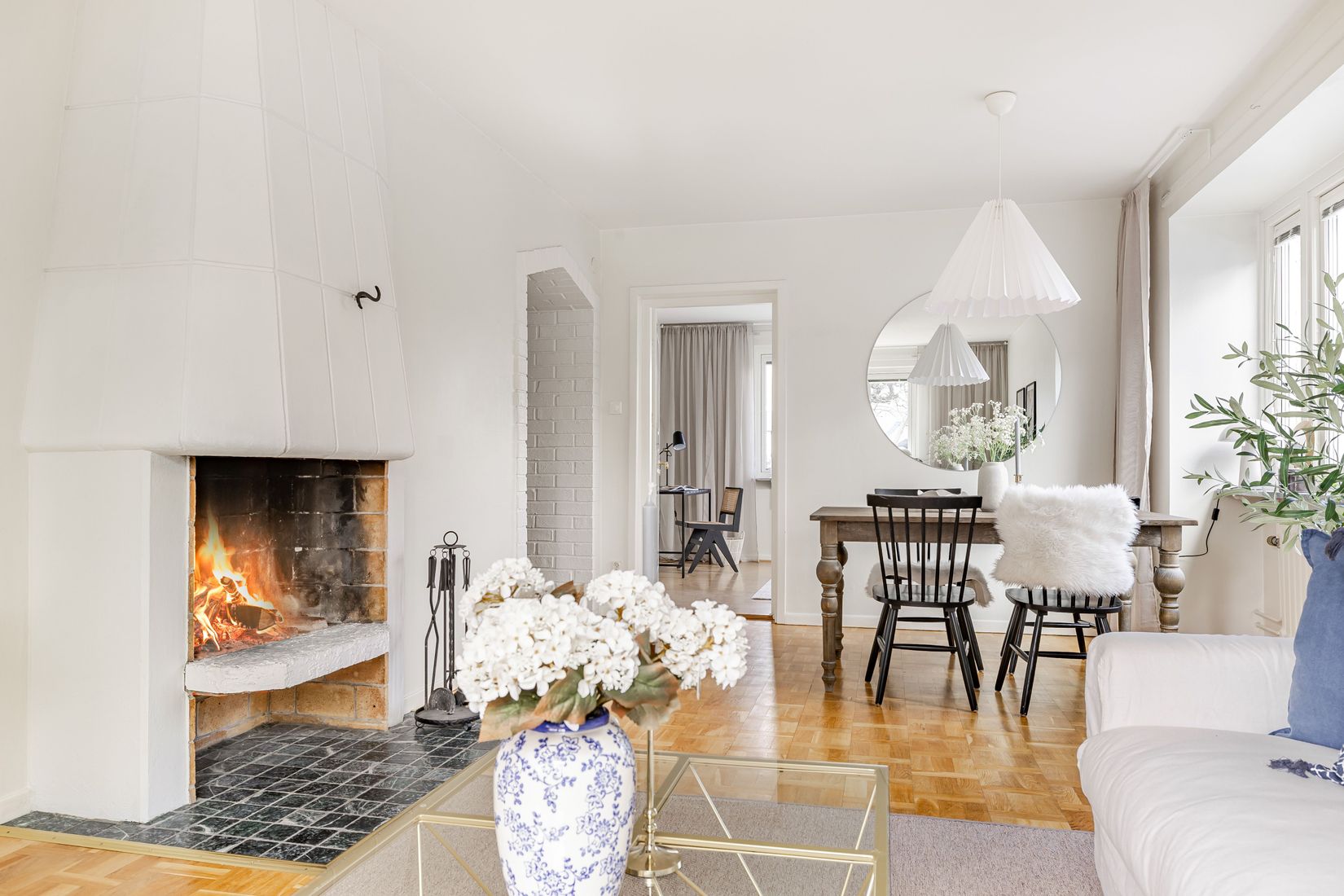 Lägenheten präglas av tidstypiska attribut och stor karaktär – luftiga rum, generösa fönsterpartier, en vacker öppen spis samt ett karaktäristiskt tegelvalv som elegant binder samman hall och vardagsrum. Planlösningen är både social och funktionell med två rymliga sovrum, rymligt och socialt kök med plats för stor matgrupp och till stor del uppdaterade vitvaror från 2026. Vidare finns en välkomnande hall och strax innanför den ett utrymme som gjort för extra förvaring eller kontorsplats.