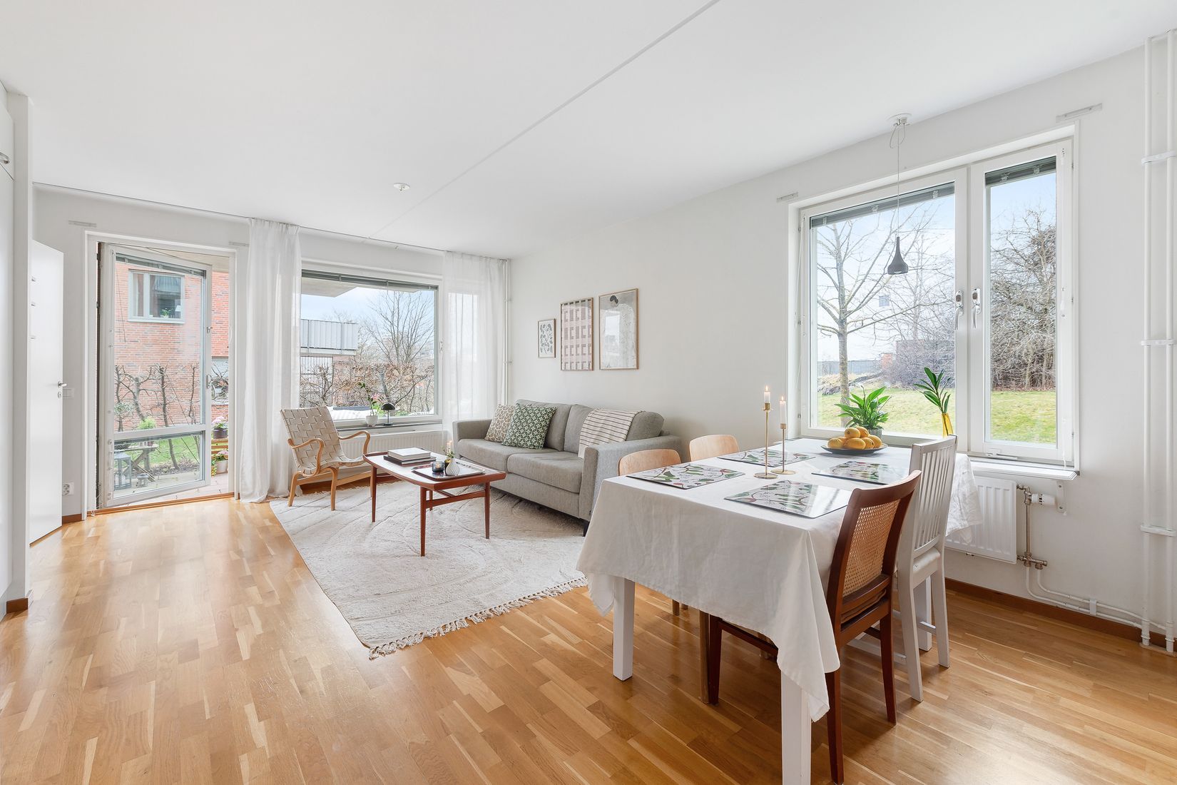 Fint vardagsrum med fönster i två väderstreck och utgång till stor uteplats med utsikt över grönskande omgivning. Fönster i två väderstreck som skapar ett härligt ljusflöde. Spännande och socialt planerad lägenhet som utnyttjas optimalt. Sovrummet rymmer med enkelhet en säng avskilt från bostaden sociala delar.